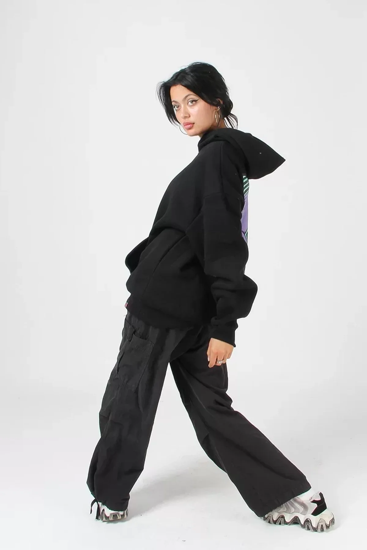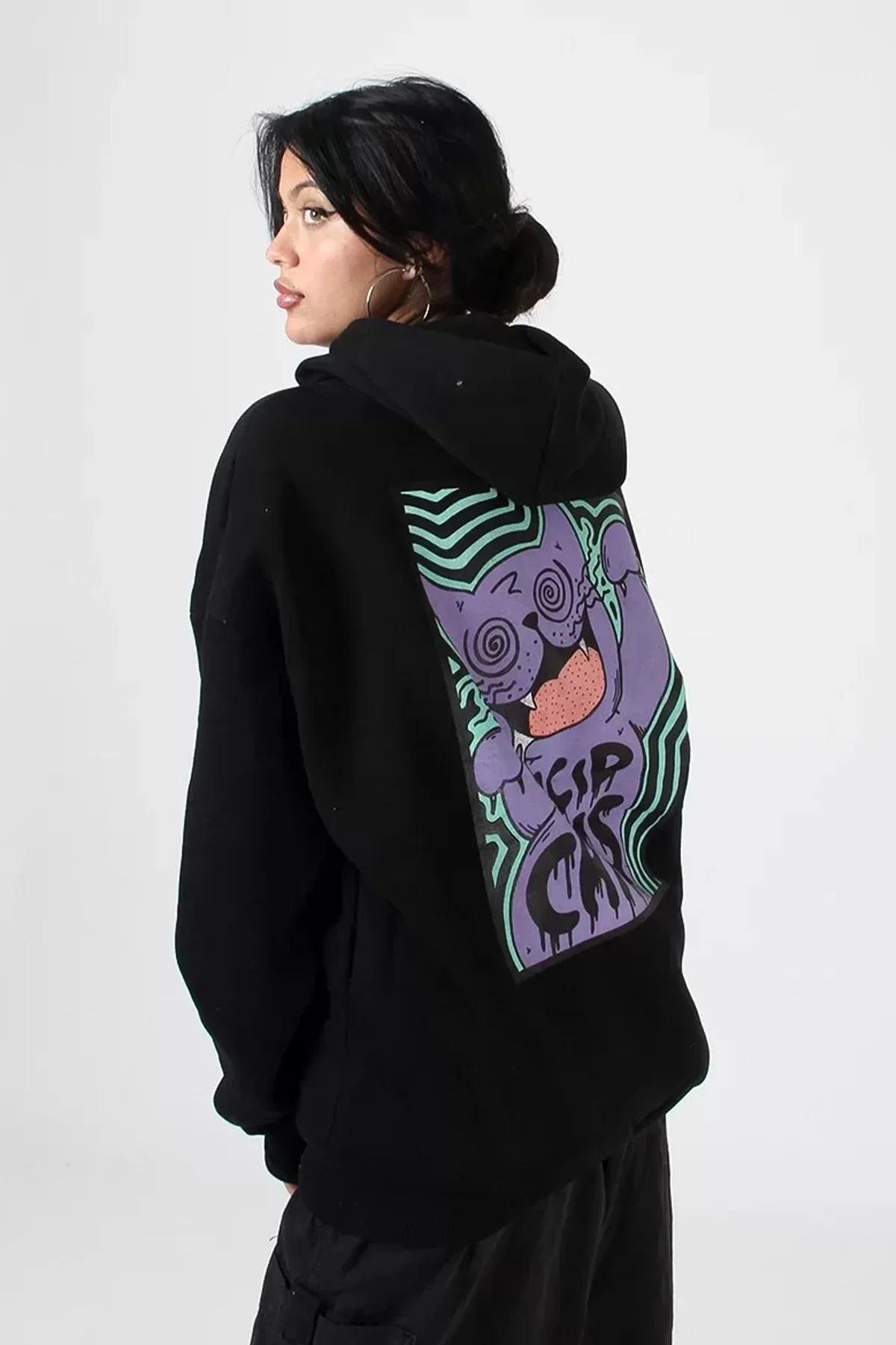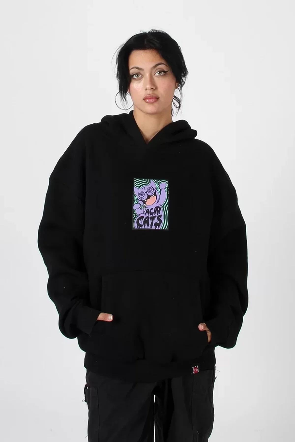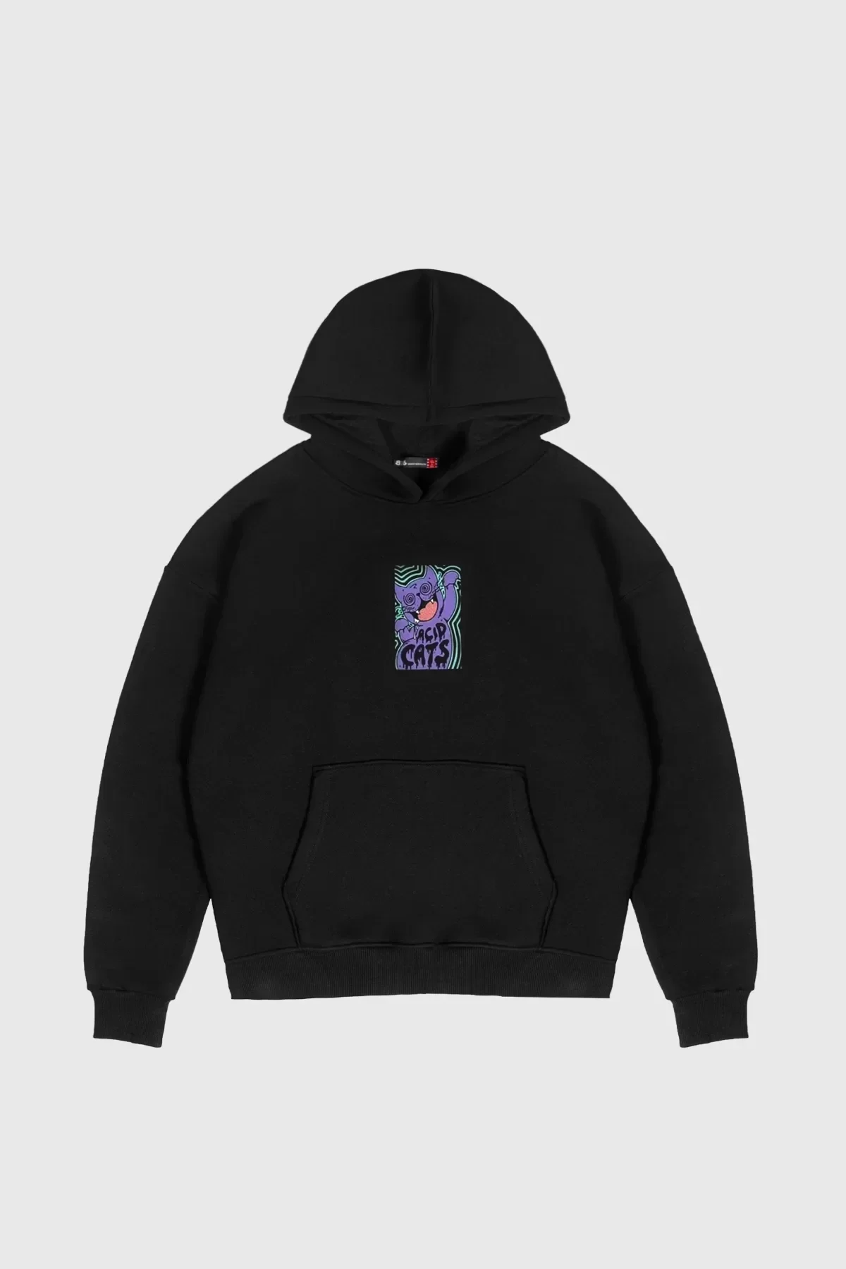 ACİD CAT SIRT BASKILI SİYAH OVERSİZE UNİSEX KAPÜŞONLU SWEATSHİRT