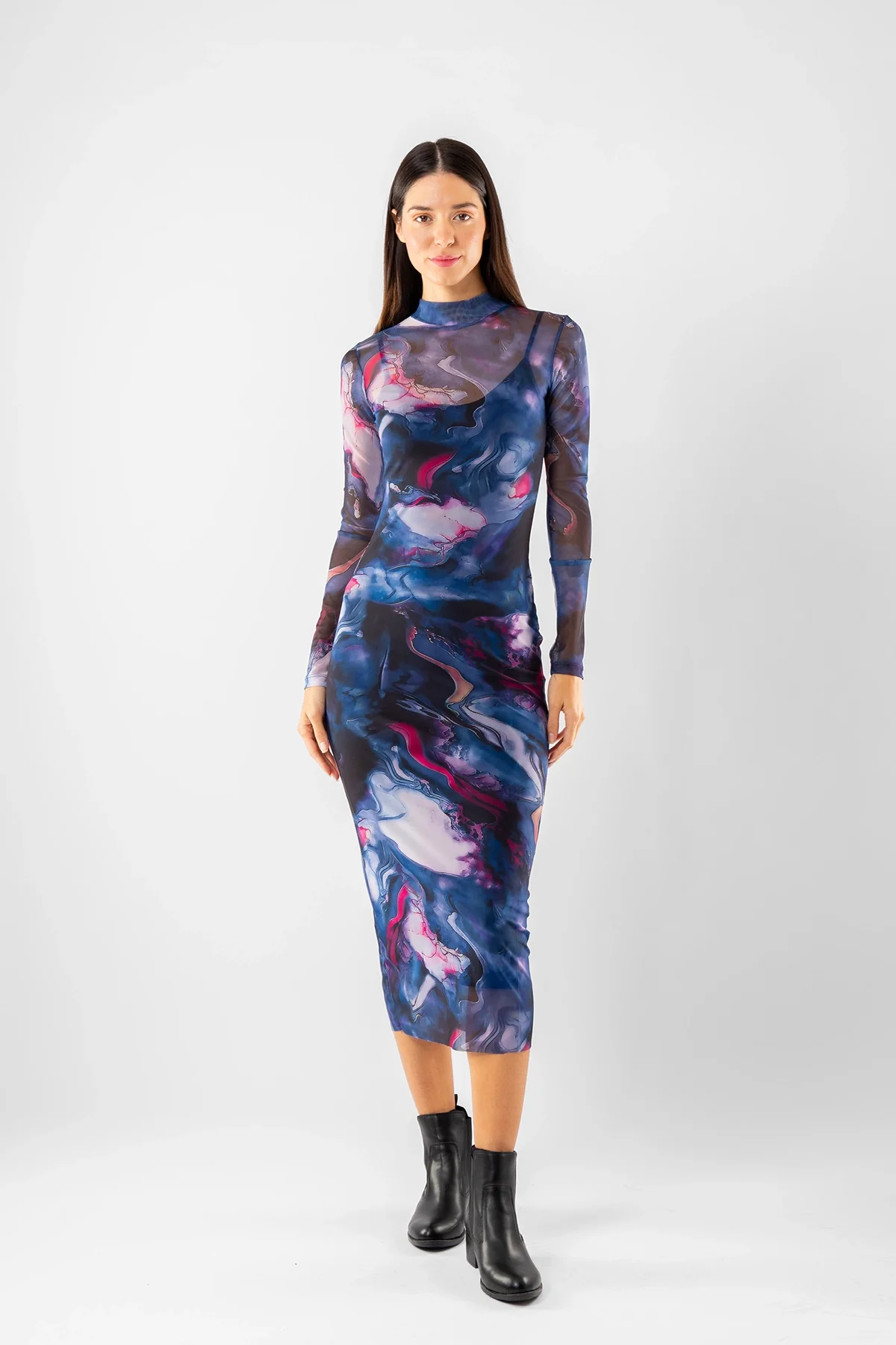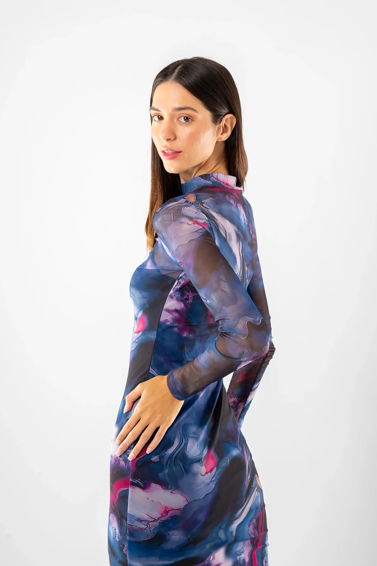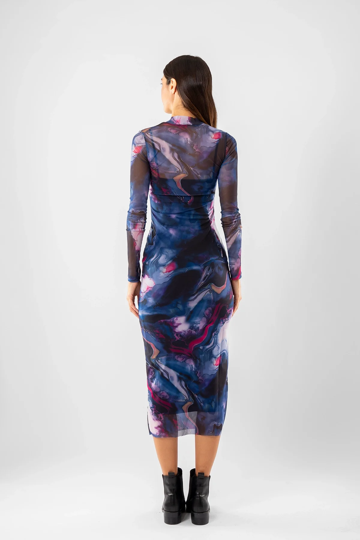 Zarif ve feminen tasarımıyla dikkat çeken, hafif tül kumaştan üretilmiş batik desenli uzun elbise. Özel davetler ve şık günler için ideal, romantik pembe tonlarıyla kusursuz bir seçim.
