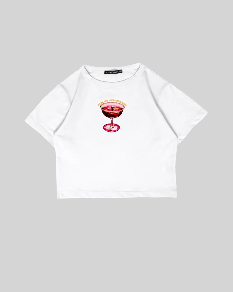 Bite My Strawberry Baskılı Beyaz Crop Top