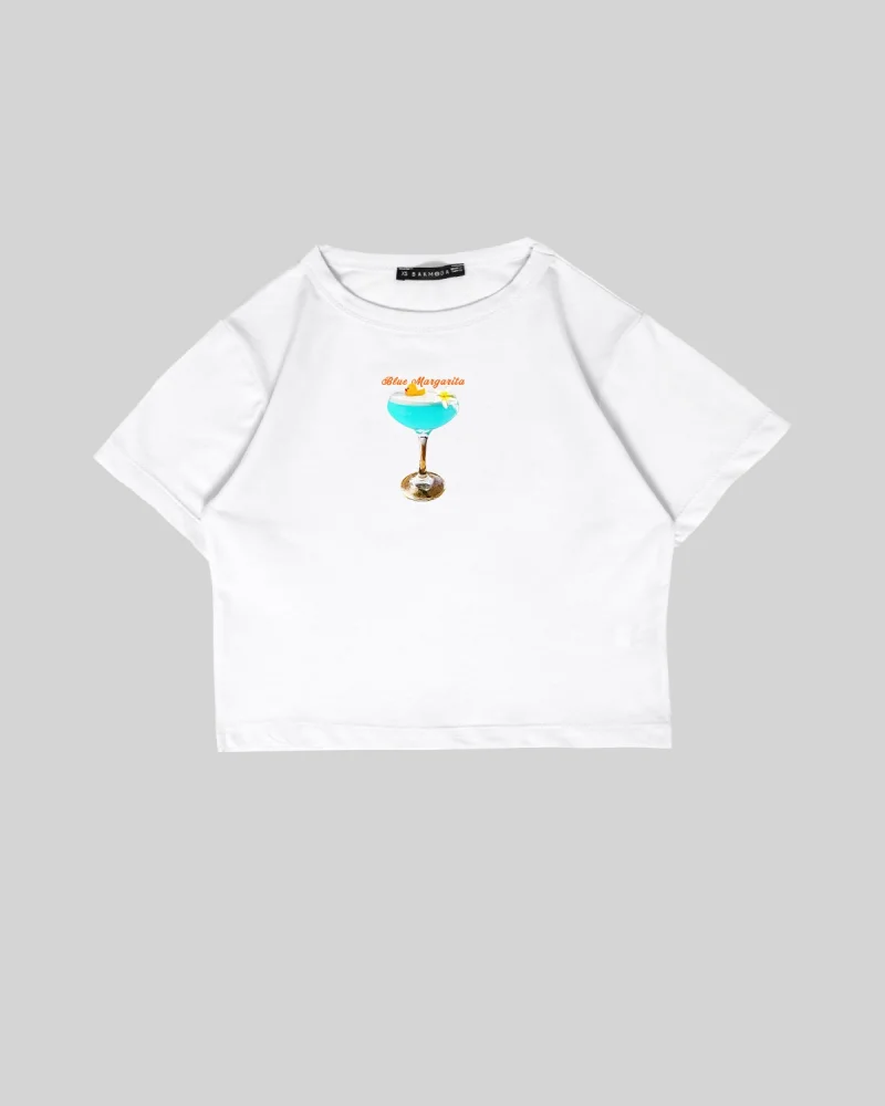 Blue Margharita Baskılı Beyaz Crop Top