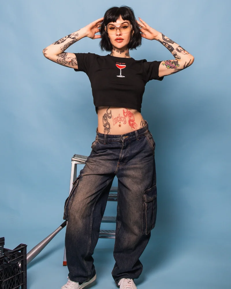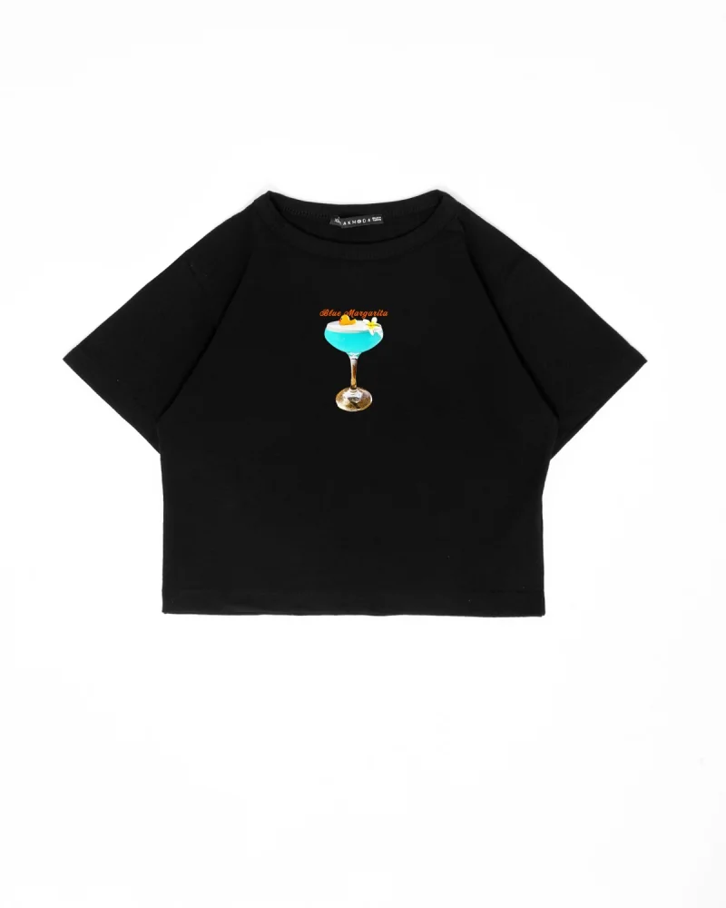 Blue Margharita Baskılı Siyah Crop Top