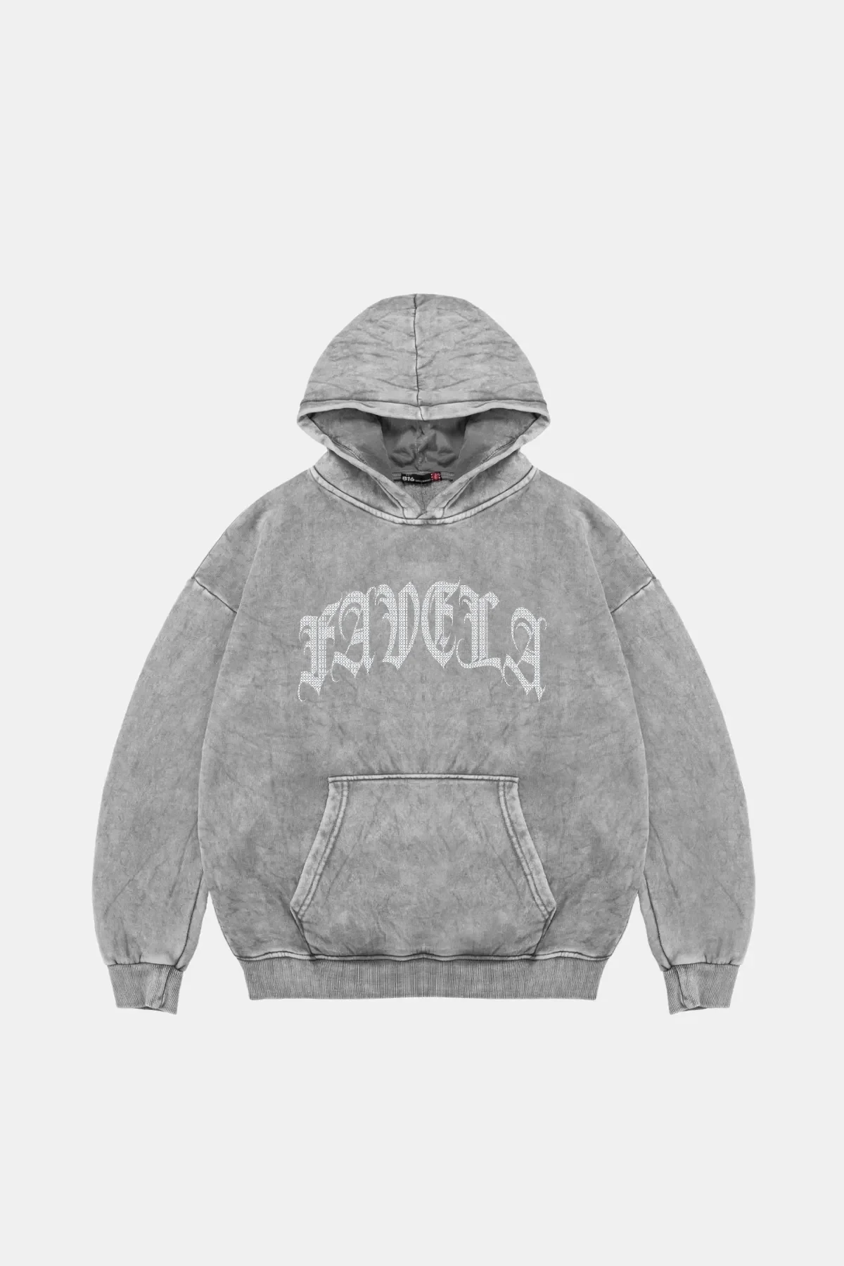 FAVELA TAŞ BASKILI OVERSİZE UNİSEX YIKAMALI BEYAZ HOODİE