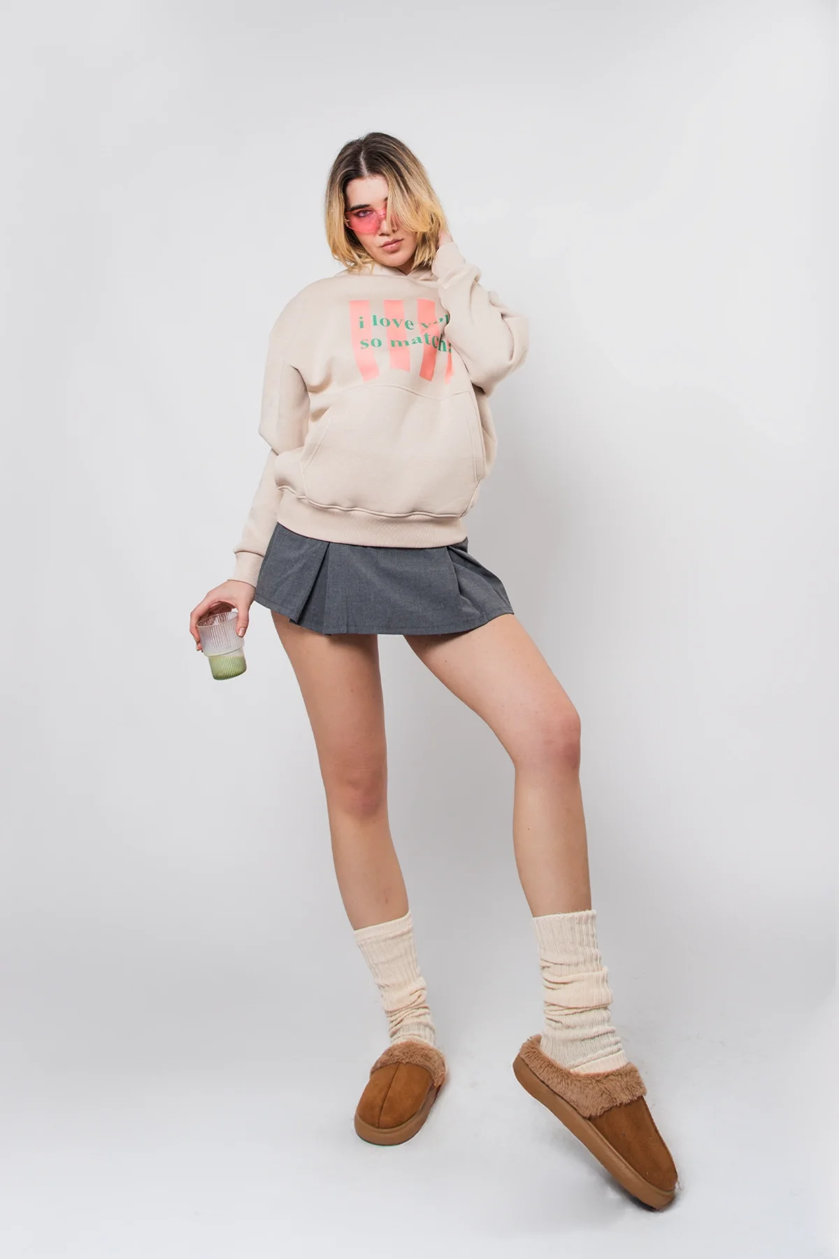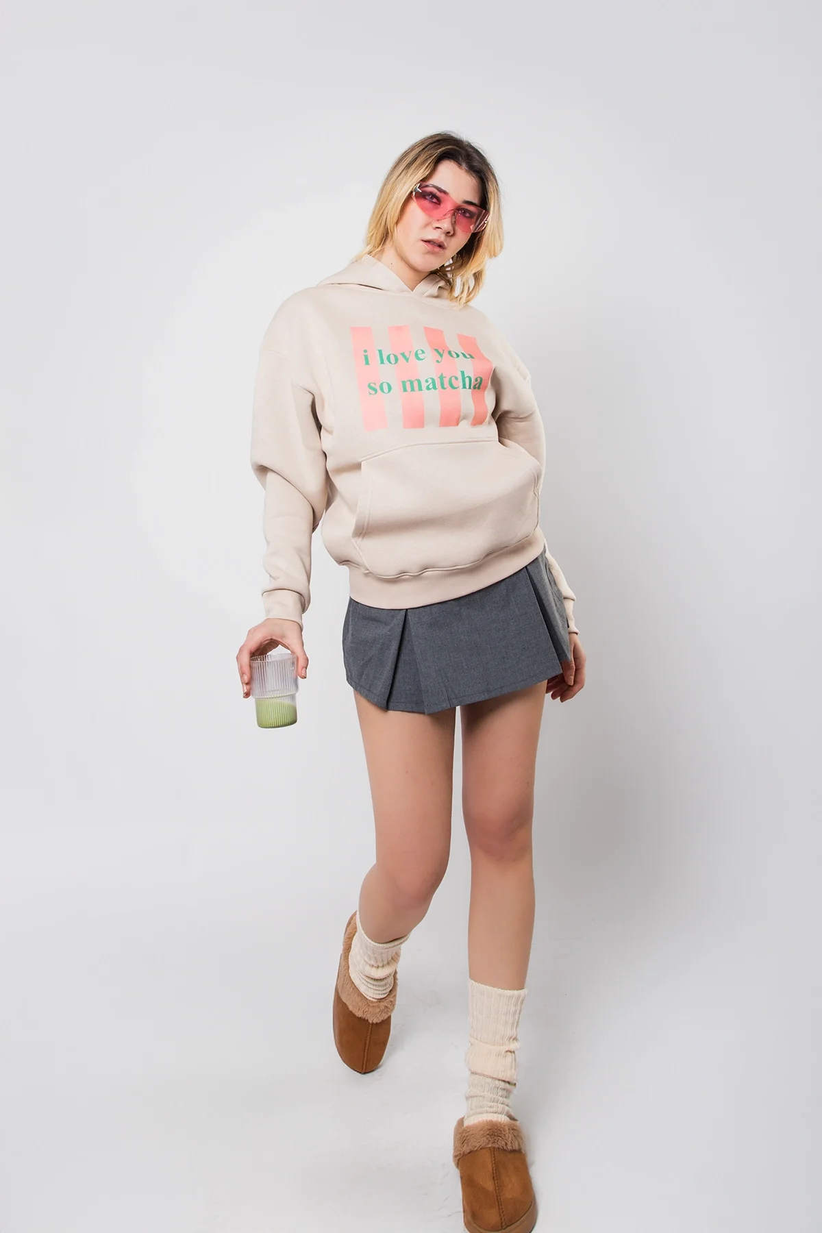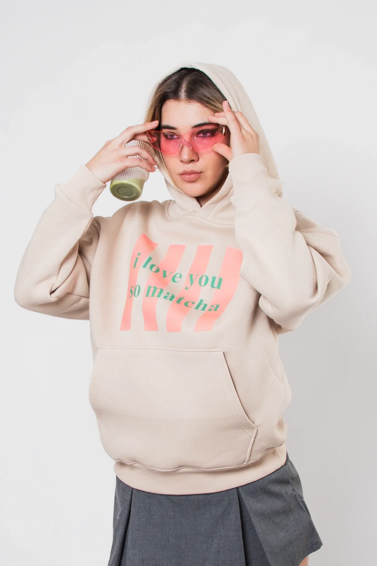 I Love You So Matcha Baskılı Oversize Unisex Bej Hoodie