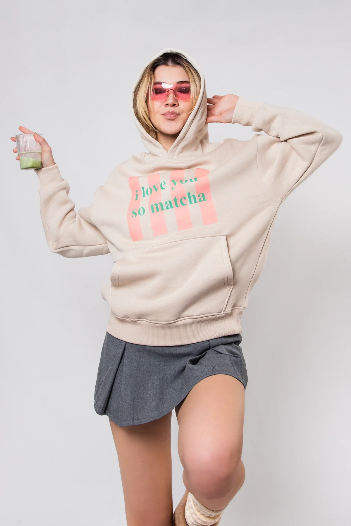 Sokak stiline ışıltılı bir dokunuş: I Love You So Matcha Baskılı Bej Hoodie, oversize kesimi ve göz alıcı detaylarıyla tarzını cesurca yansıtmak isteyenler için tasarlandı.