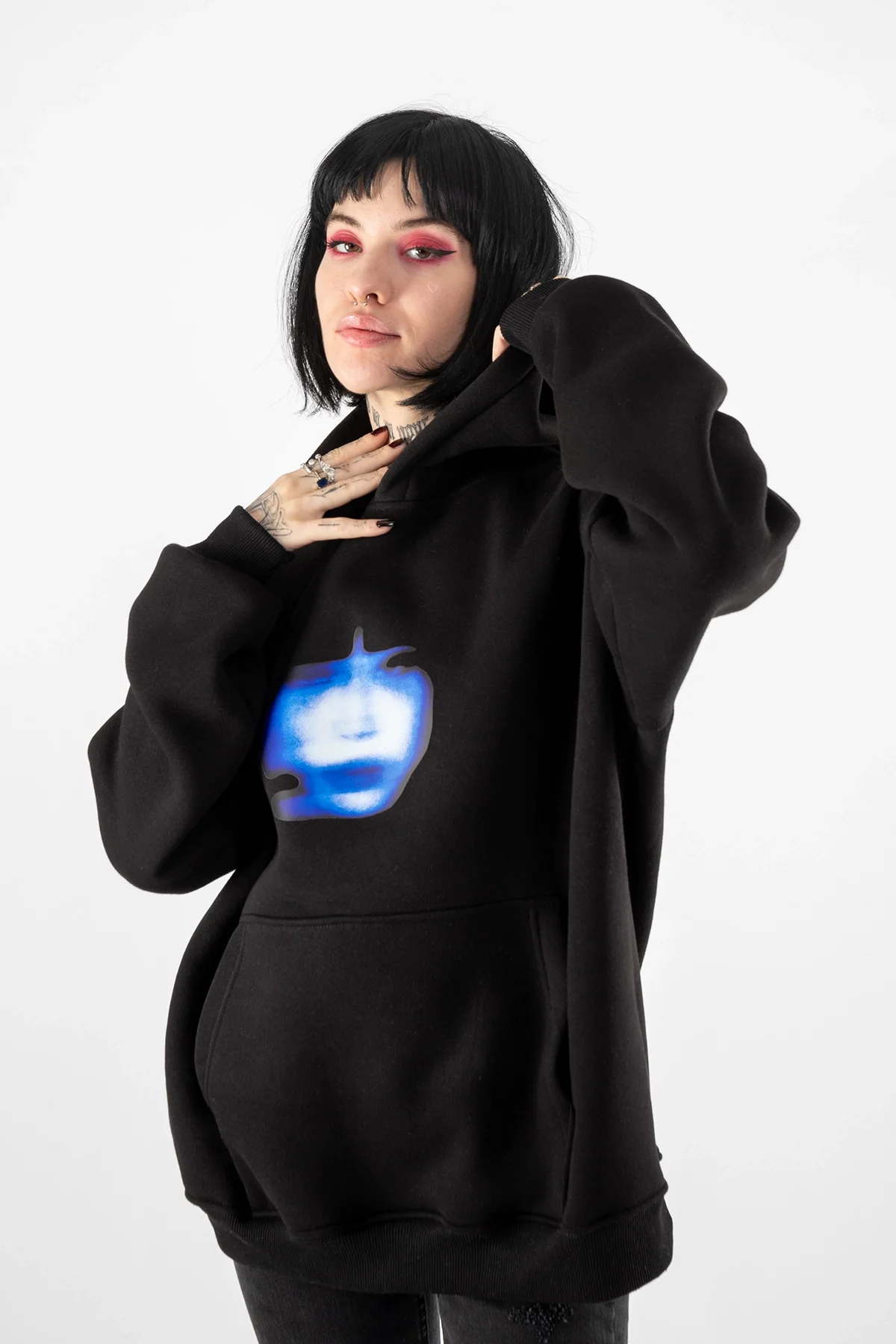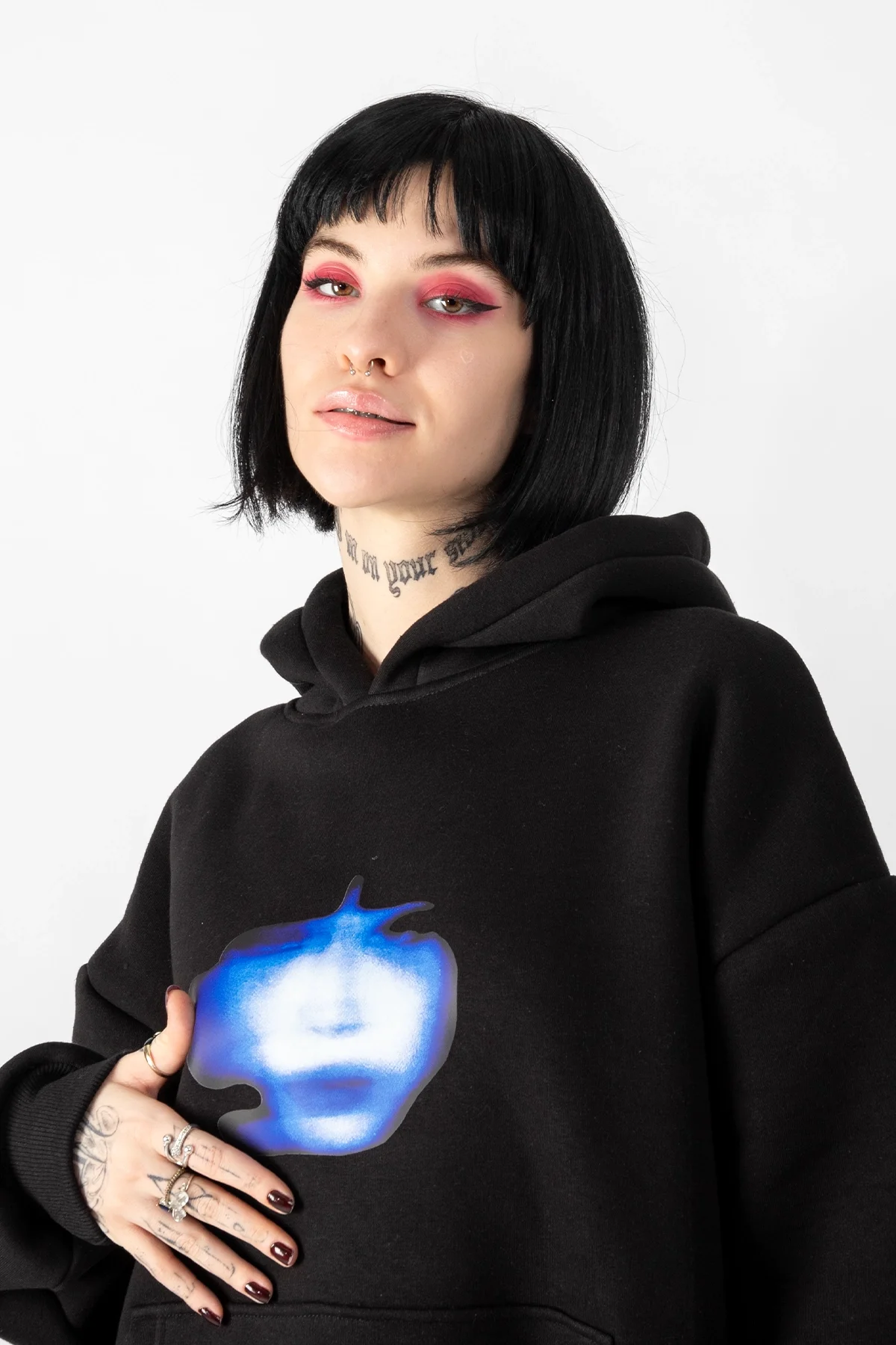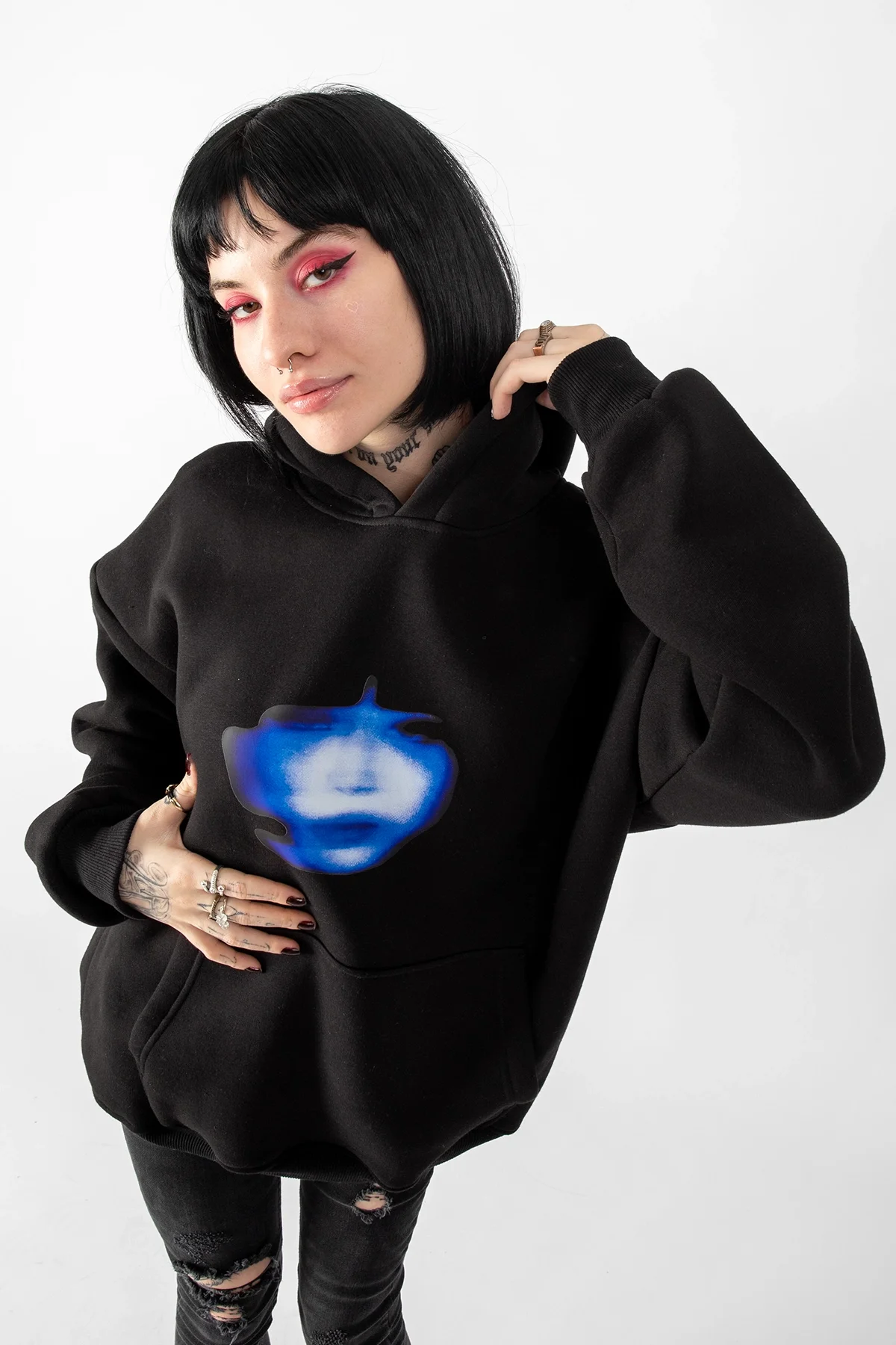 ILLUSİON FACE BASKILI OVERSİZE UNİSEX SİYAH HOODİE