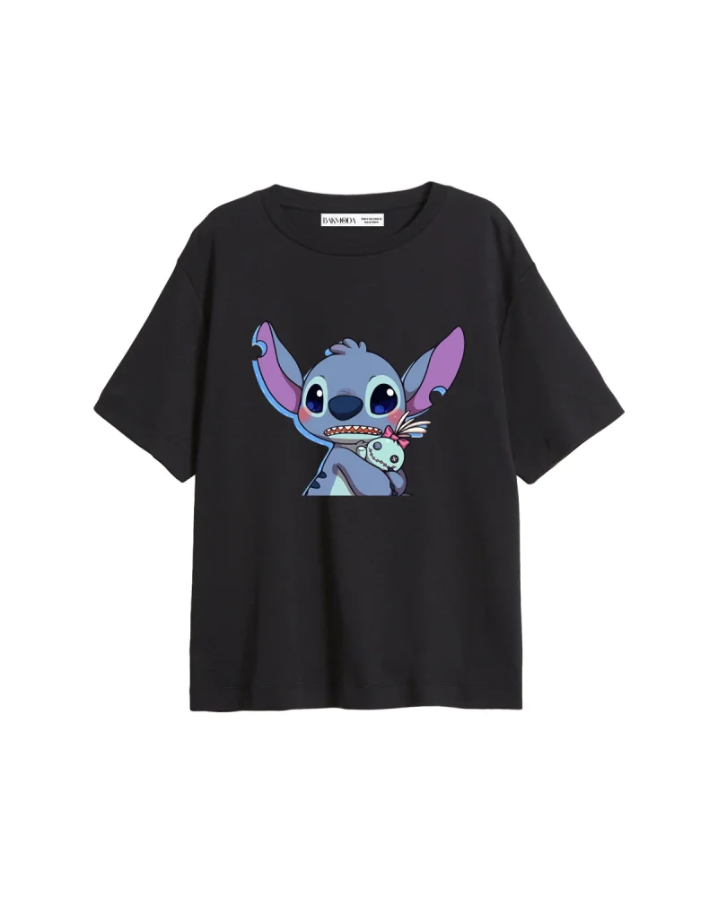 Stitch Baby Baskılı Relaxed Fit Siyah Kadın Tshirt