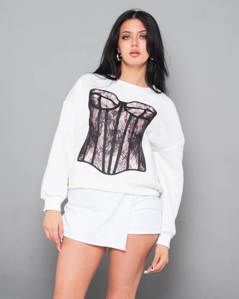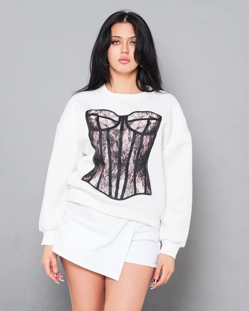 Sassy Corset Baskılı Kapüşonsuz Relaxed Fit Kadın Beyaz Sweatshirt