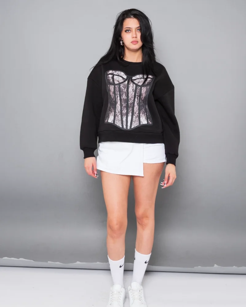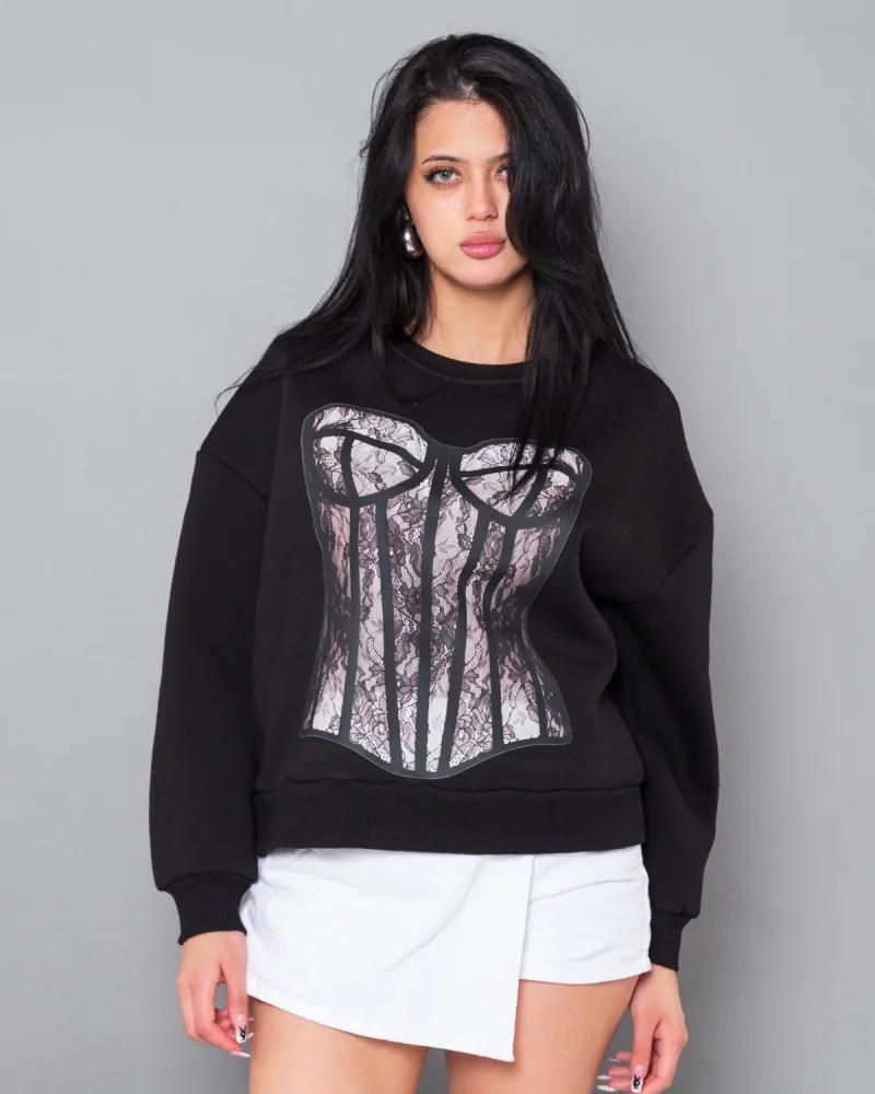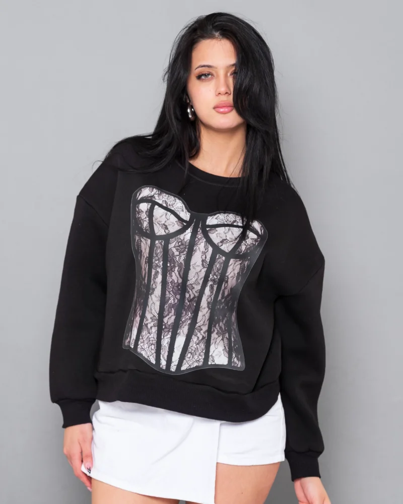 Sassy Corset Baskılı Kapüşonsuz Relaxed Fit Kadın Siyah Sweatshirt