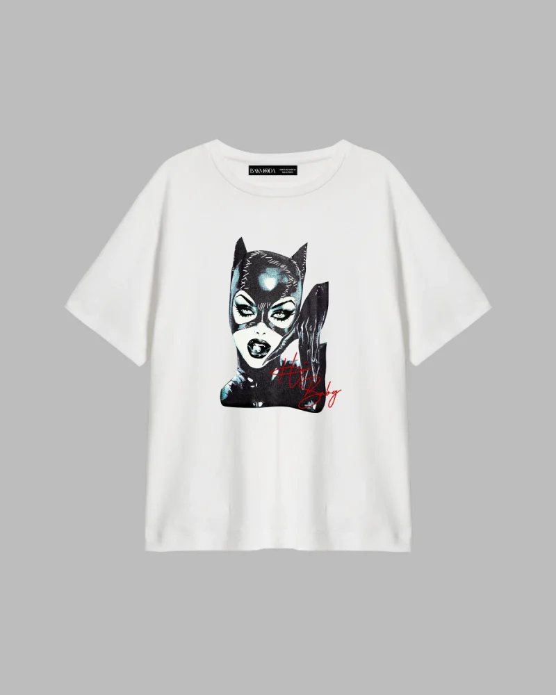 Cat Woman Baskılı Relaxed Fit Beyaz Kadın Tshirt