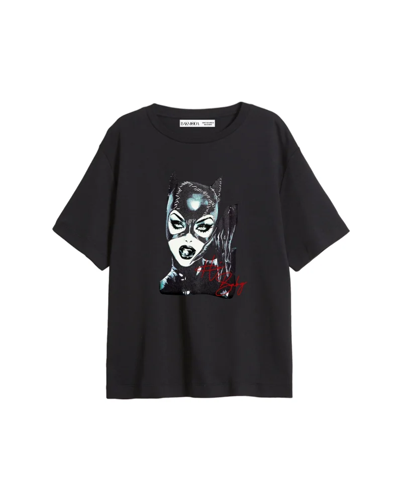 Cat Woman Baskılı Relaxed Fit Siyah Kadın Tshirt