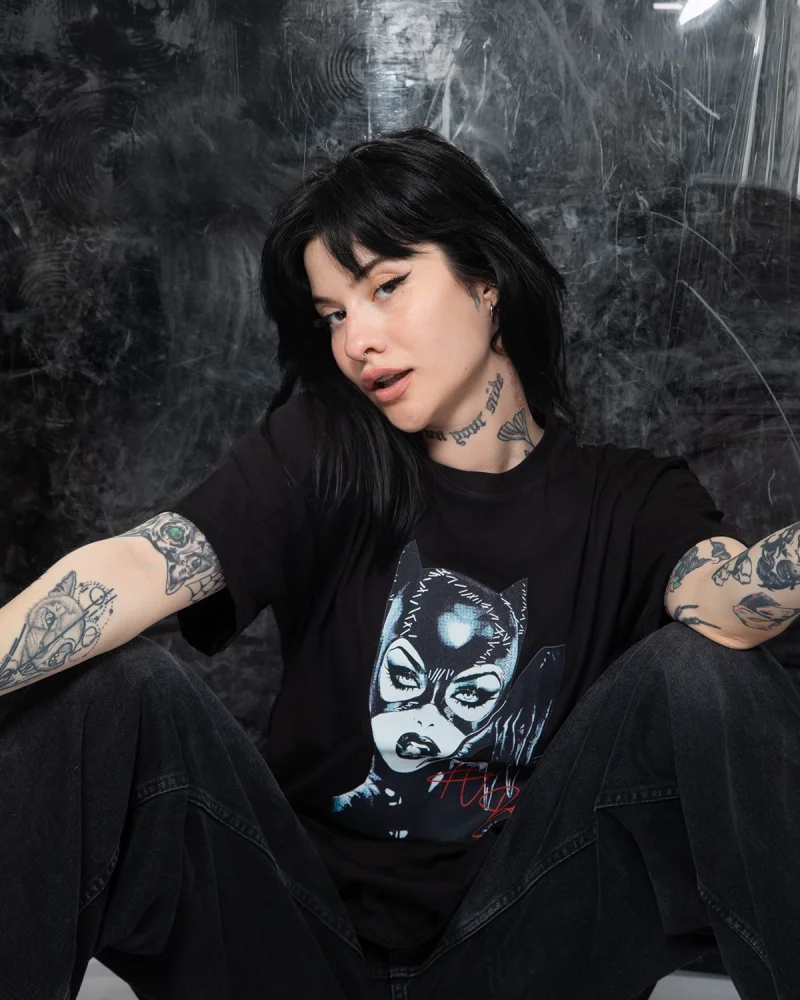 Cat Woman Baskılı Oversize Unisex Yıkamalı Siyah Tshirt