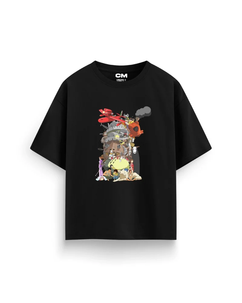 Ghibli Dreams Baskılı Rahat Kalıp 30/1 Unisex Siyah Tshirt