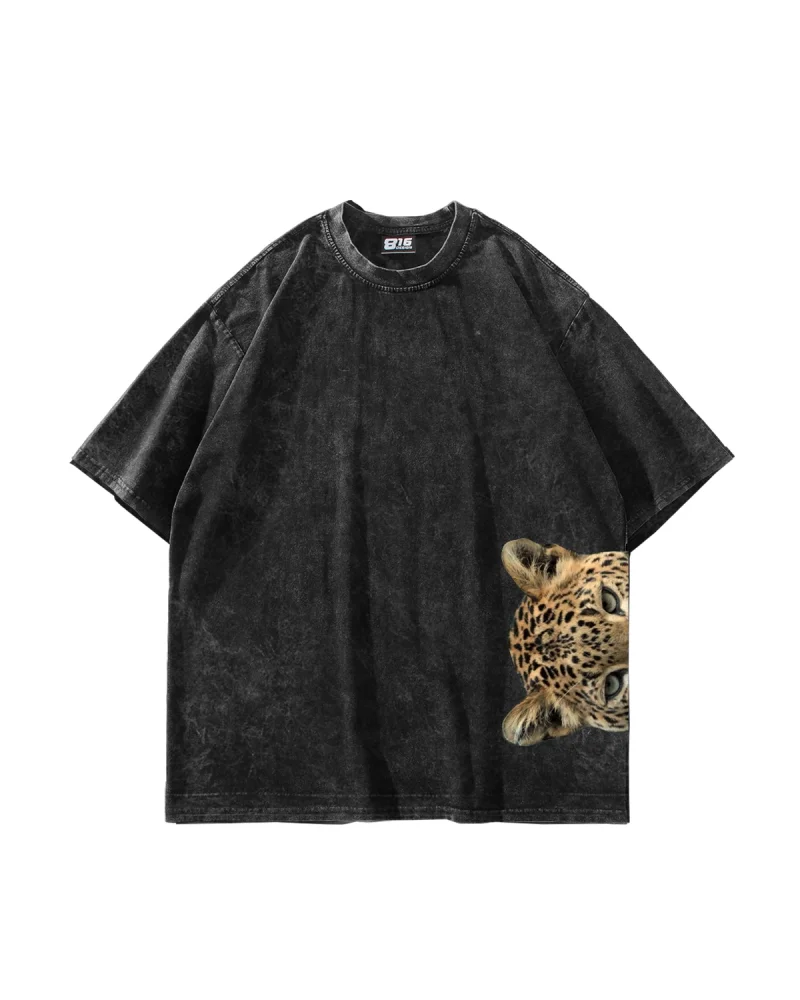 Jaguar Baskılı Oversize Unisex Yıkamalı Siyah Tshirt
