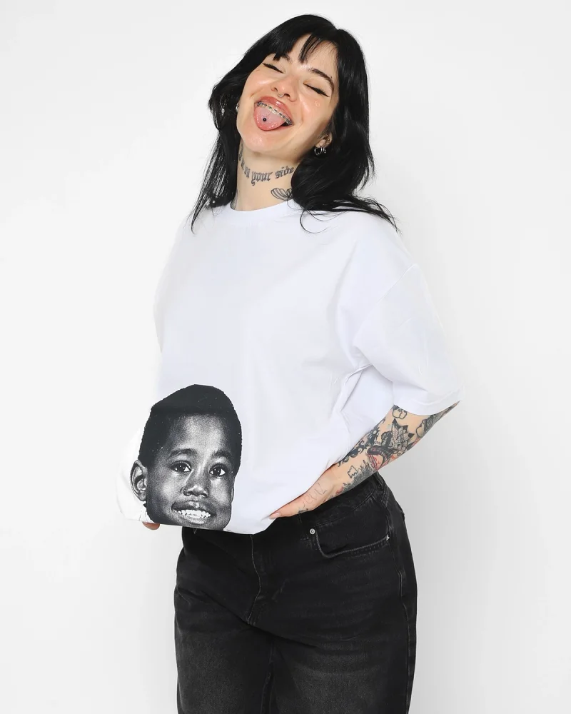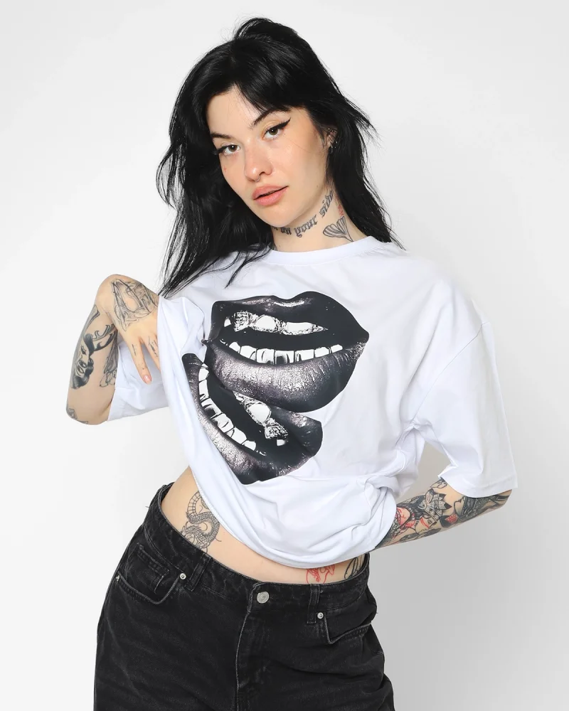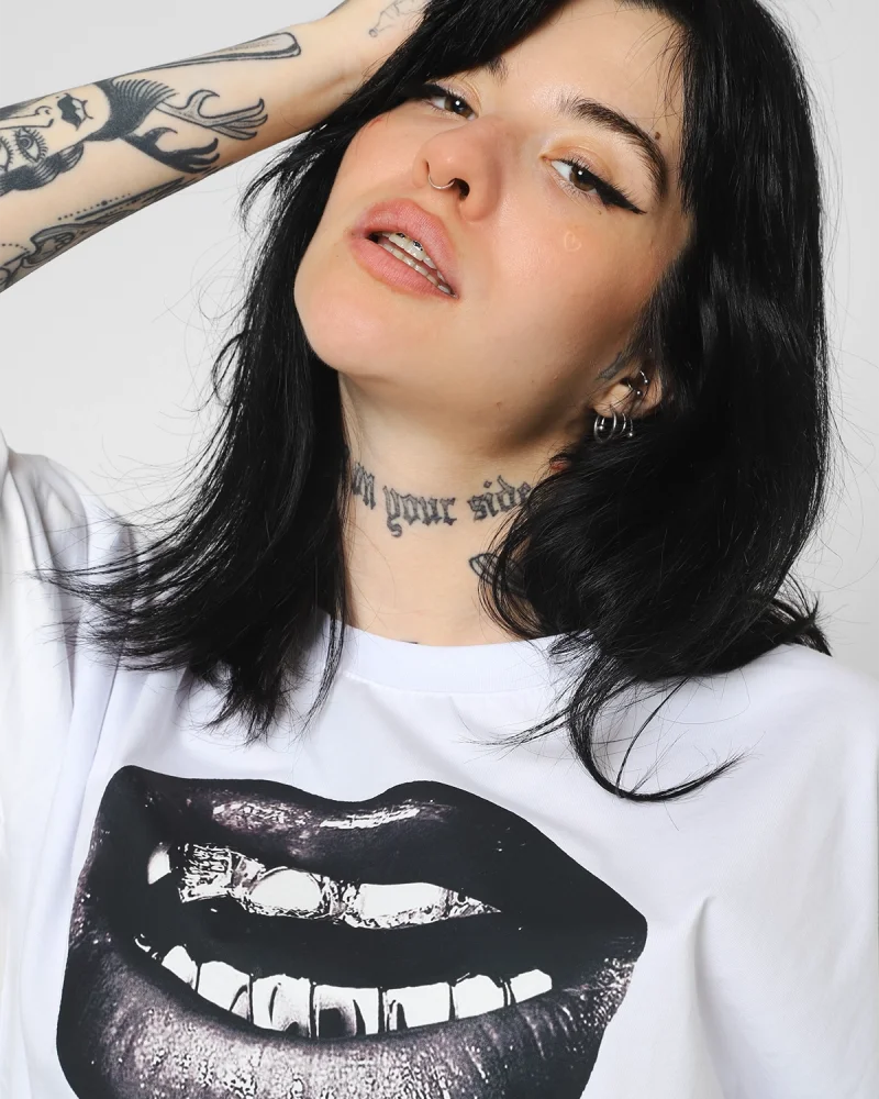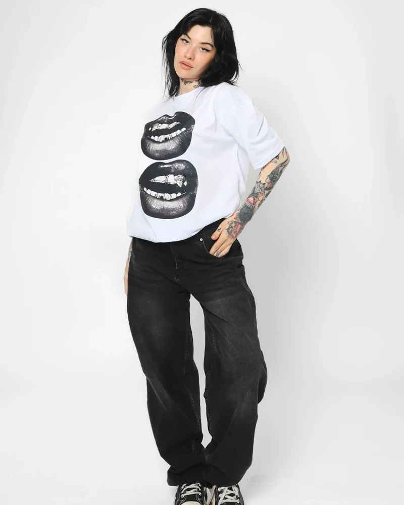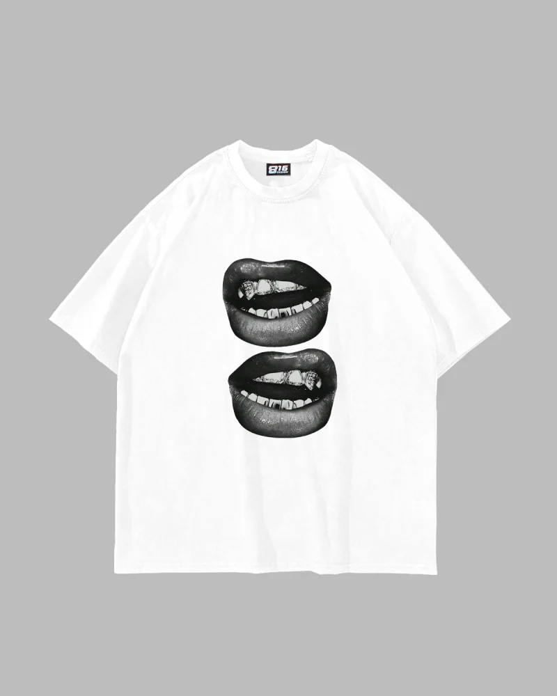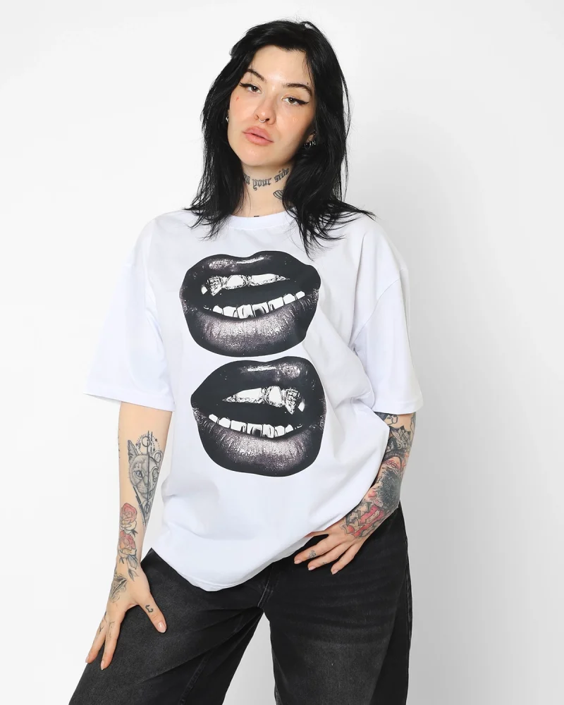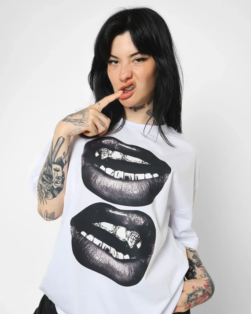 Lip Teeths Baskılı Oversize Unisex Beyaz Tshirt