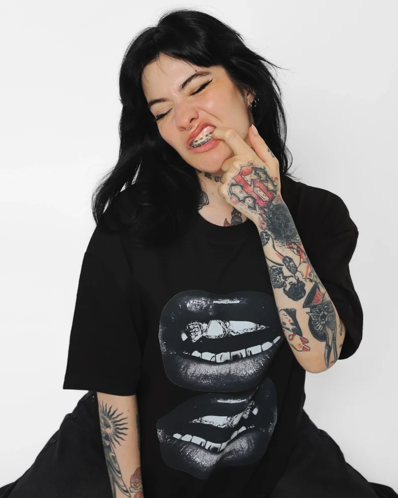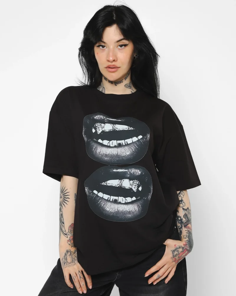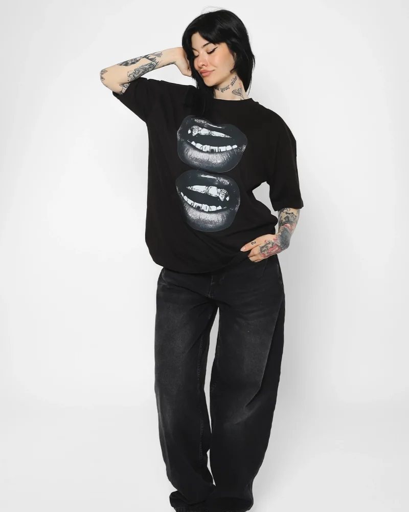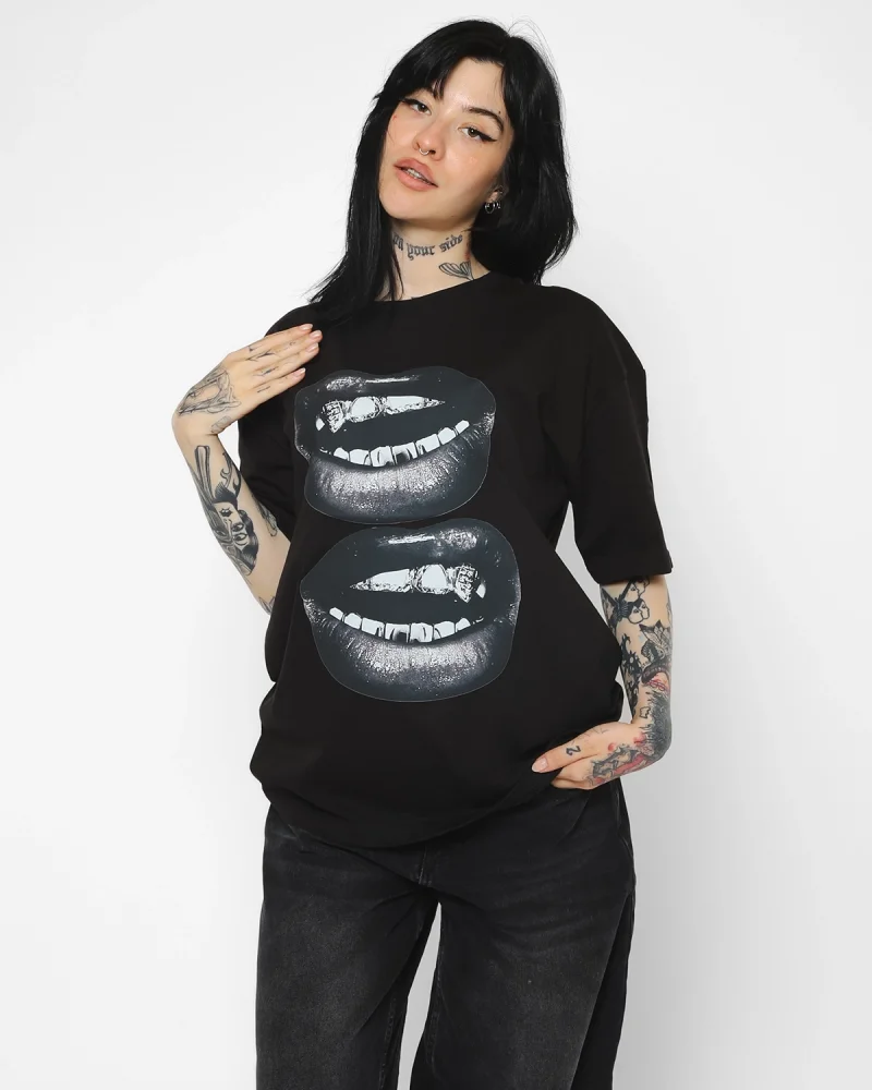 Lip Teeths Baskılı Oversize Unisex Siyah Tshirt