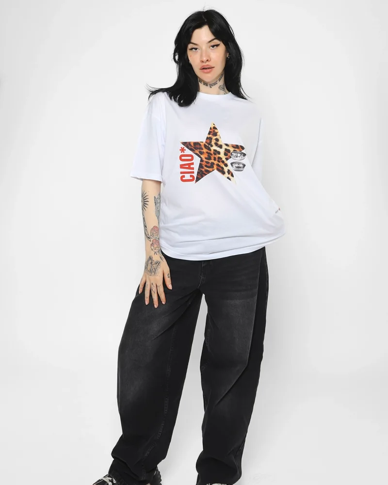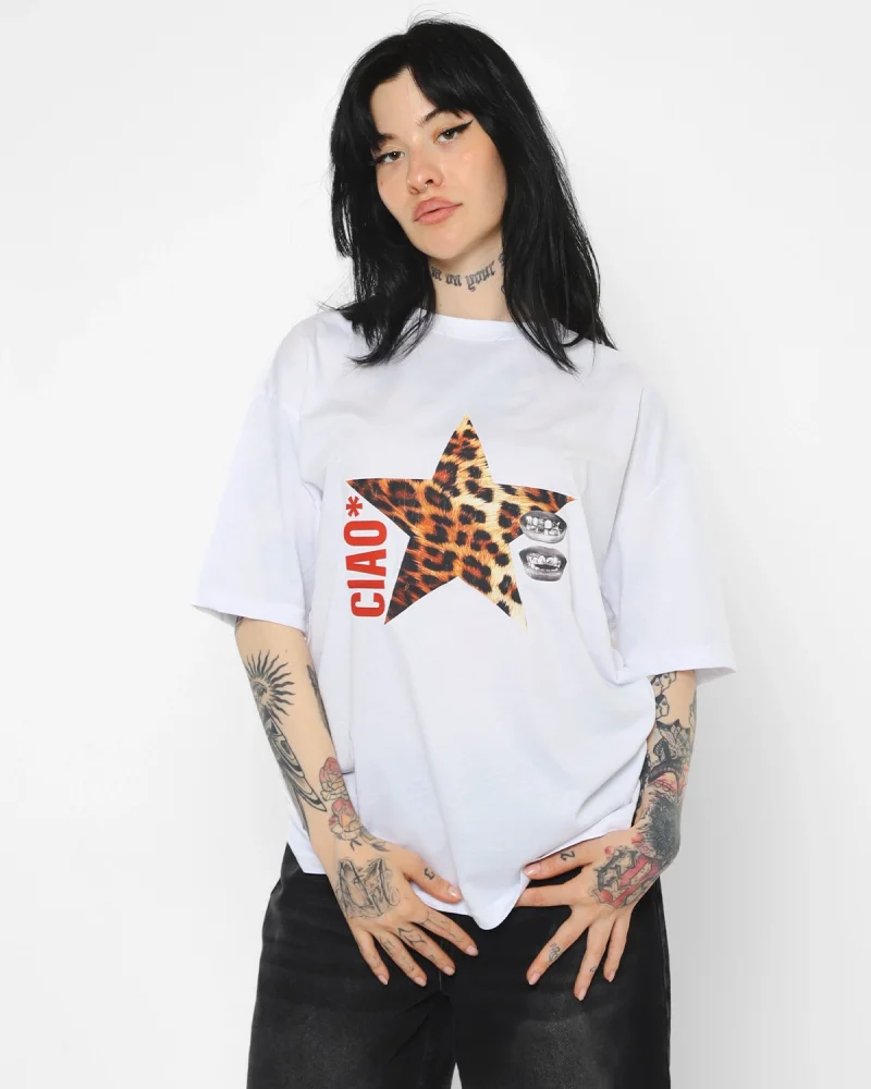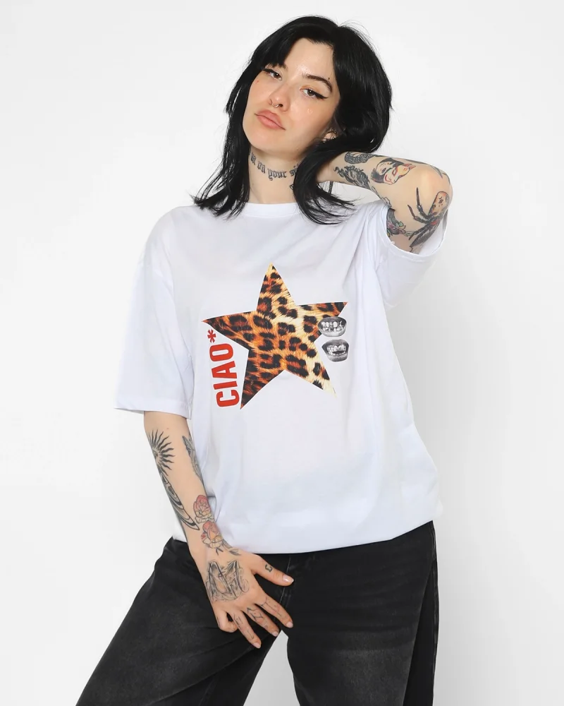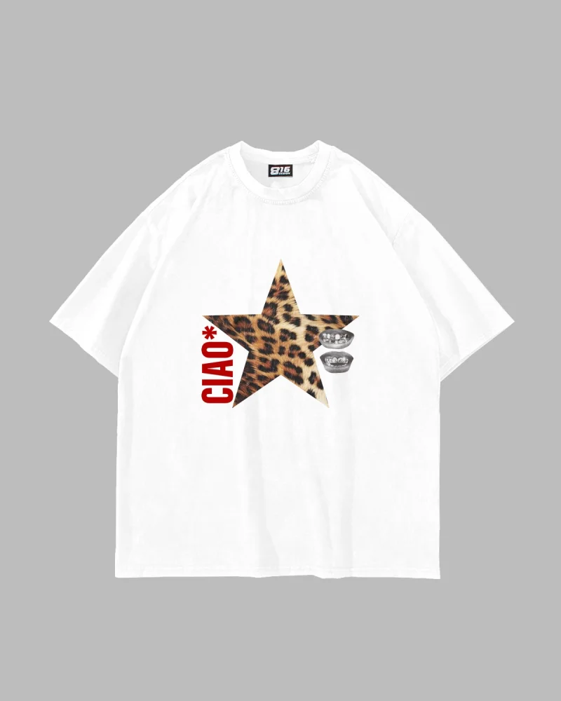 Ciao Yıldız Baskılı Oversize Unisex Beyaz Tshirt