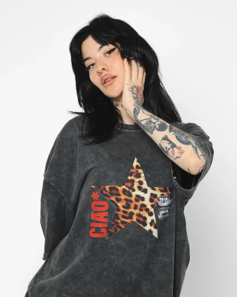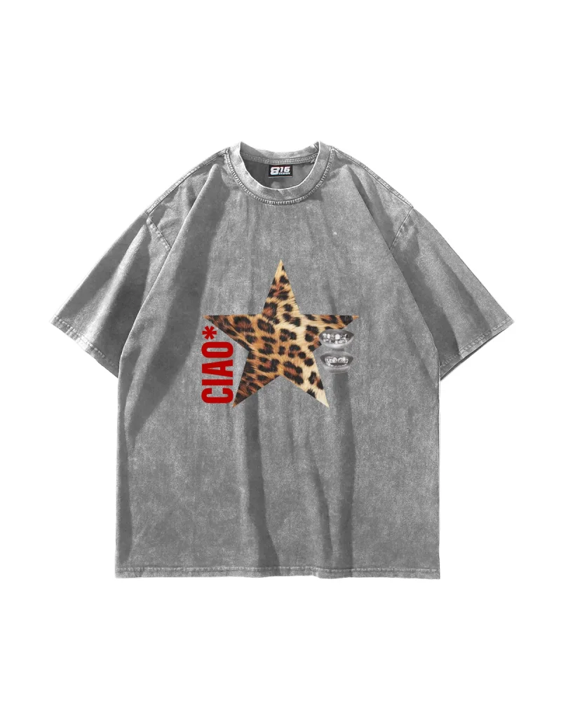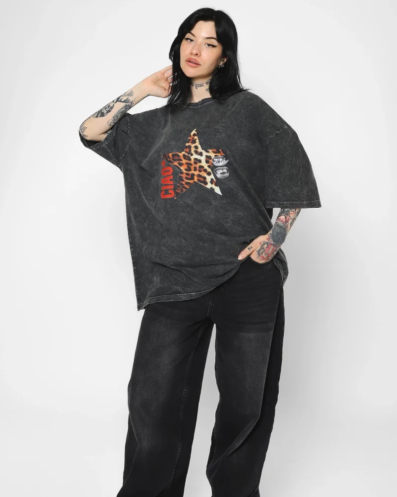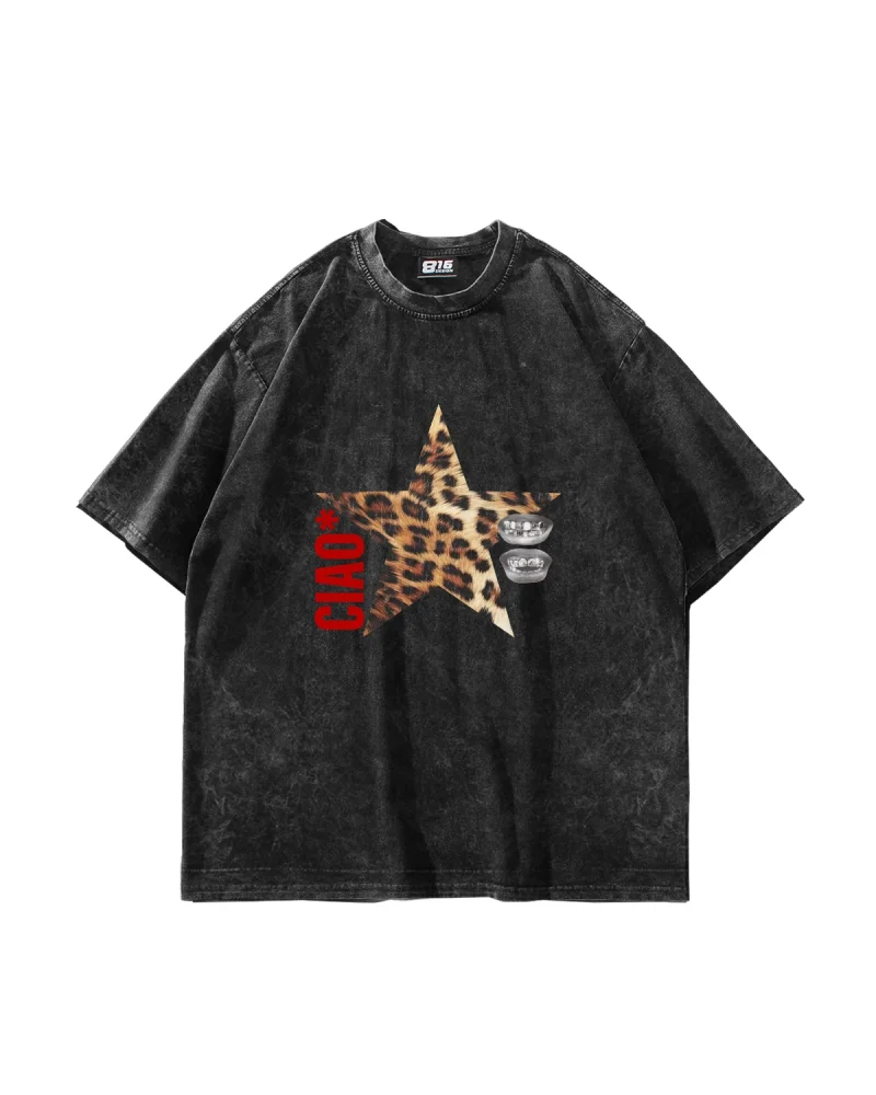 Ciao Yıldız Baskılı Oversize Unisex Yıkamalı Siyah Tshirt