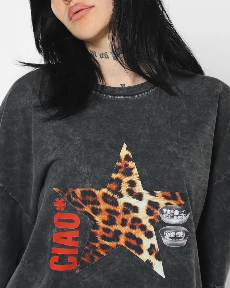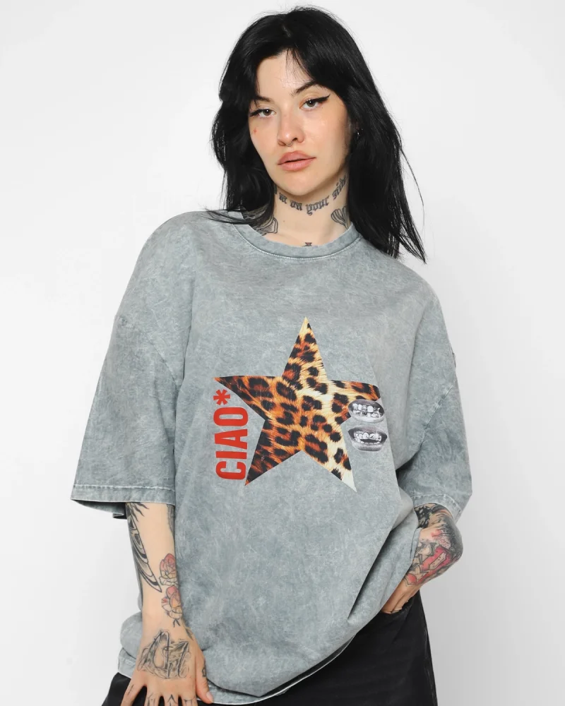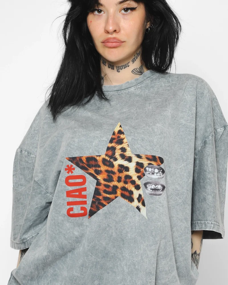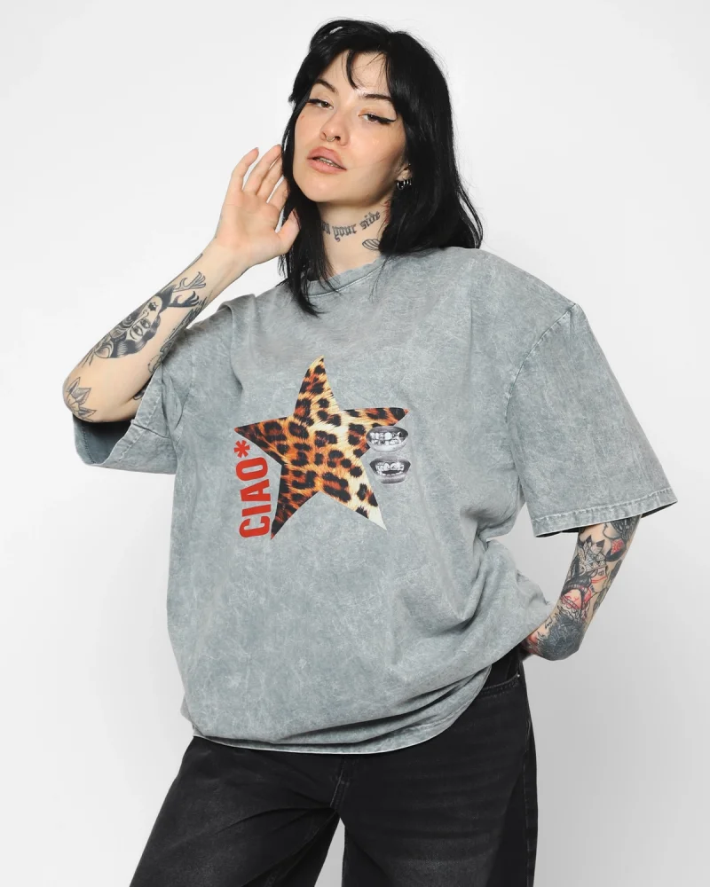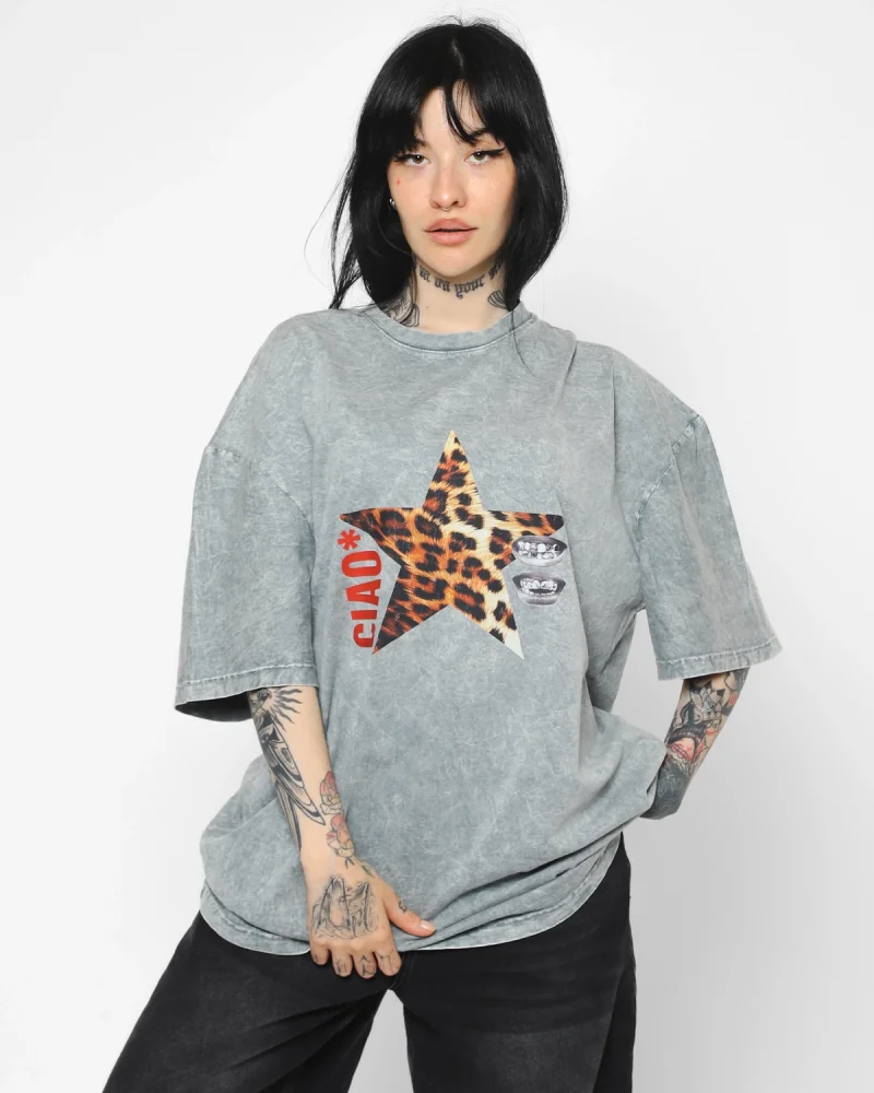 Ciao Yıldız Baskılı Oversize Unisex Yıkamalı Siyah Tshirt