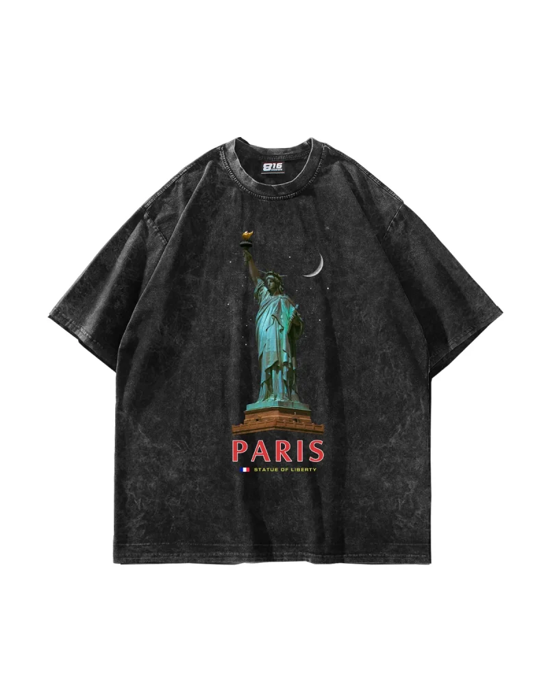 Parıs State Of Lıberty Baskılı Oversize Unisex Yıkamalı Siyah Tshirt