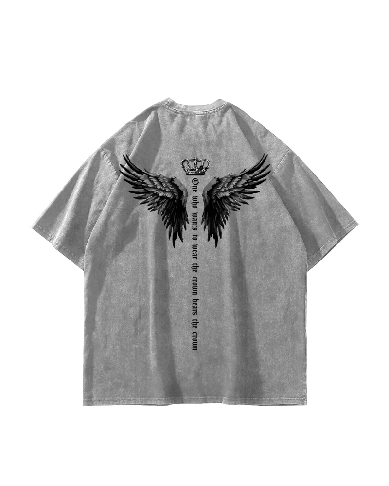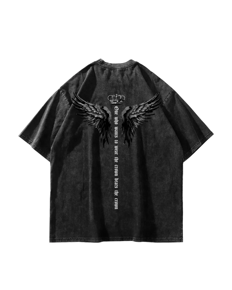 Wınged Crown Baskılı Oversize Unisex Yıkamalı Siyah Tshirt