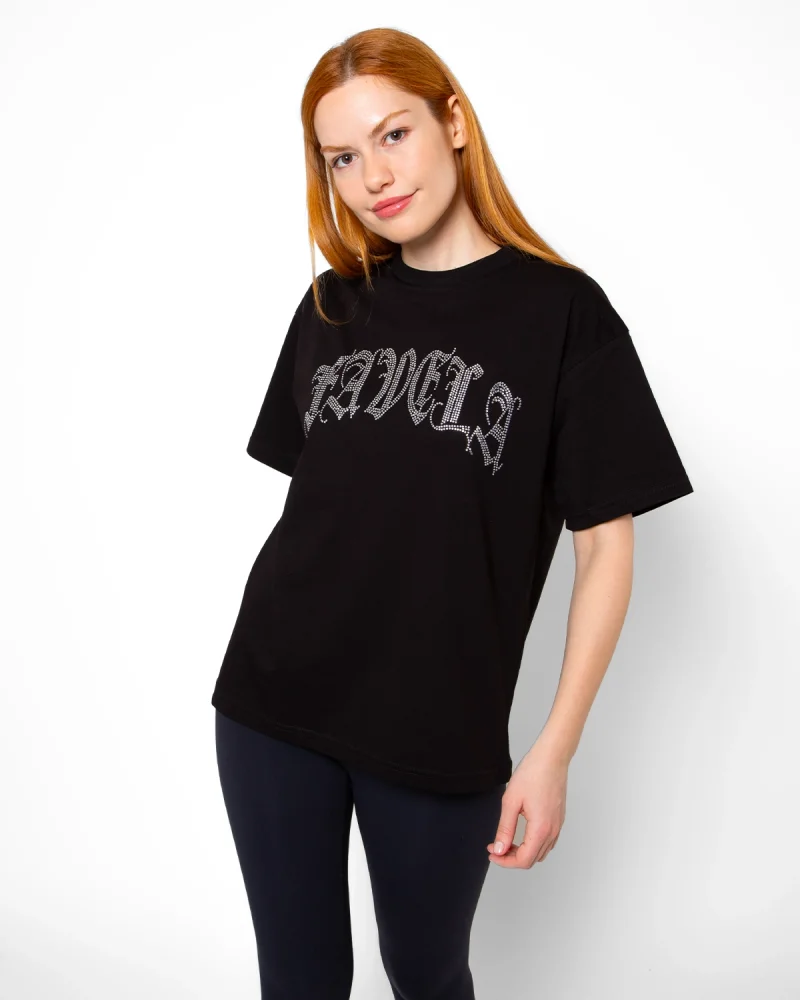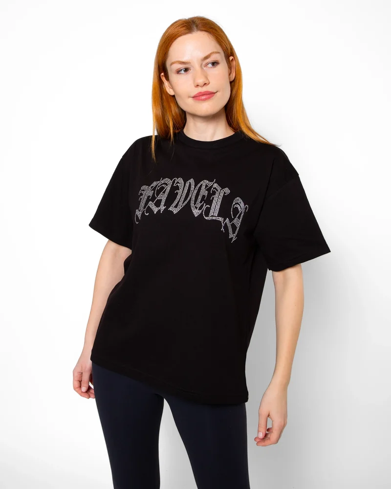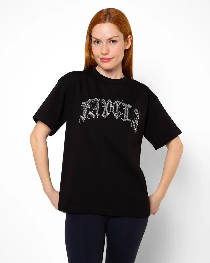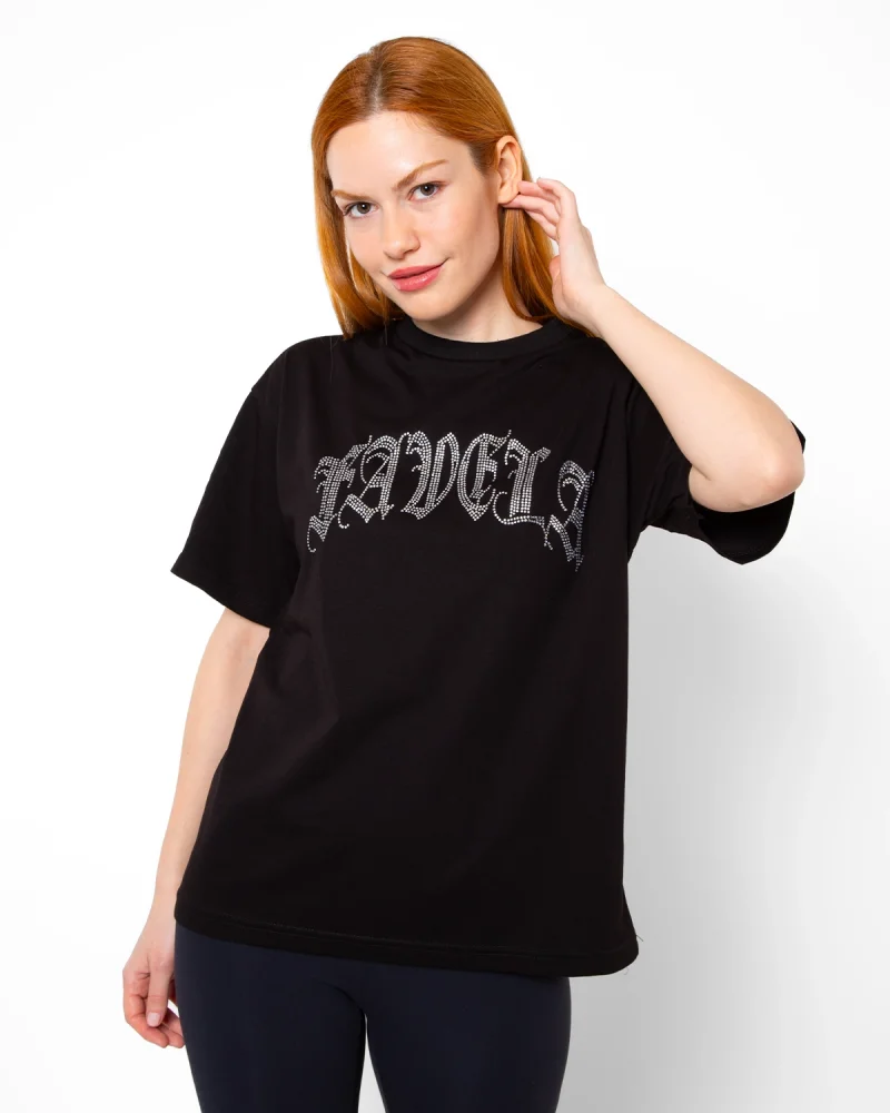 Favela Taş Baskılı Relaxed Fit Siyah Kadın Tshirt