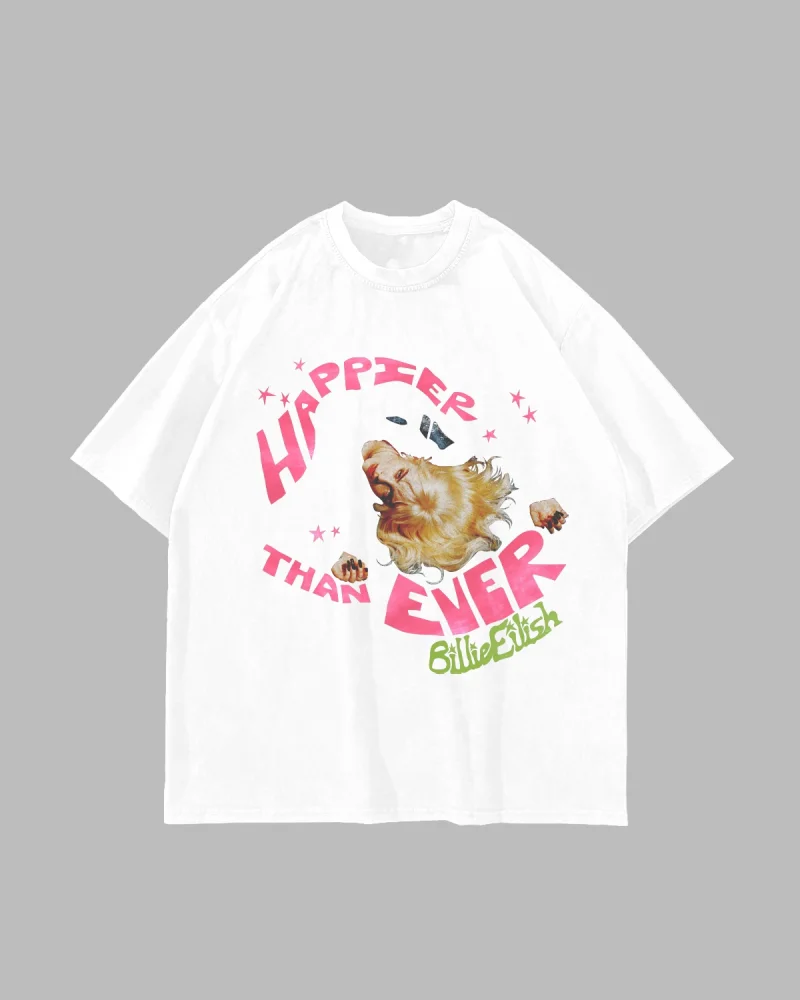 Happier Than Ever Baskılı Oversize Unisex Beyaz Tshirt