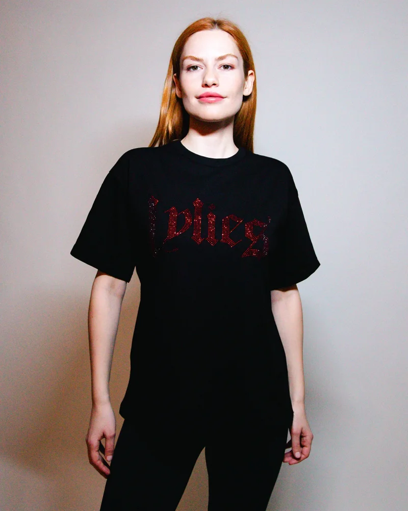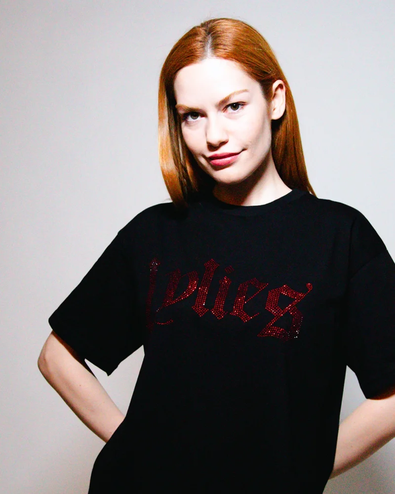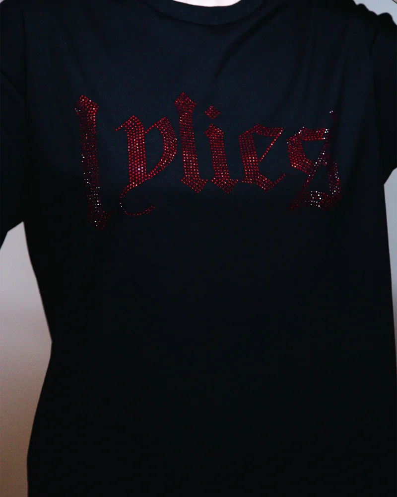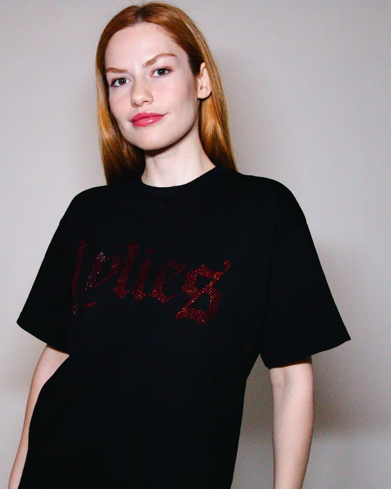 Lylies Kırmızı Taş Baskılı Relaxed Fit Siyah Kadın Tshirt