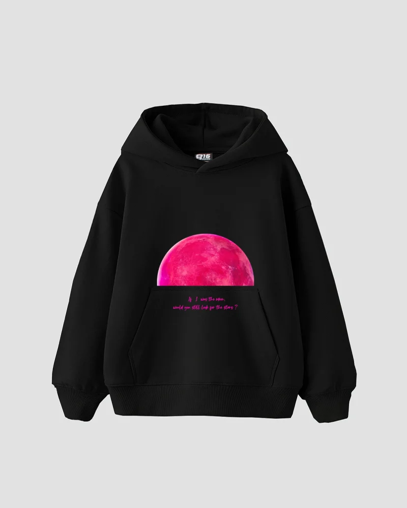 Moon İs Alone Baskılı Oversize Unisex Siyah Hoodie