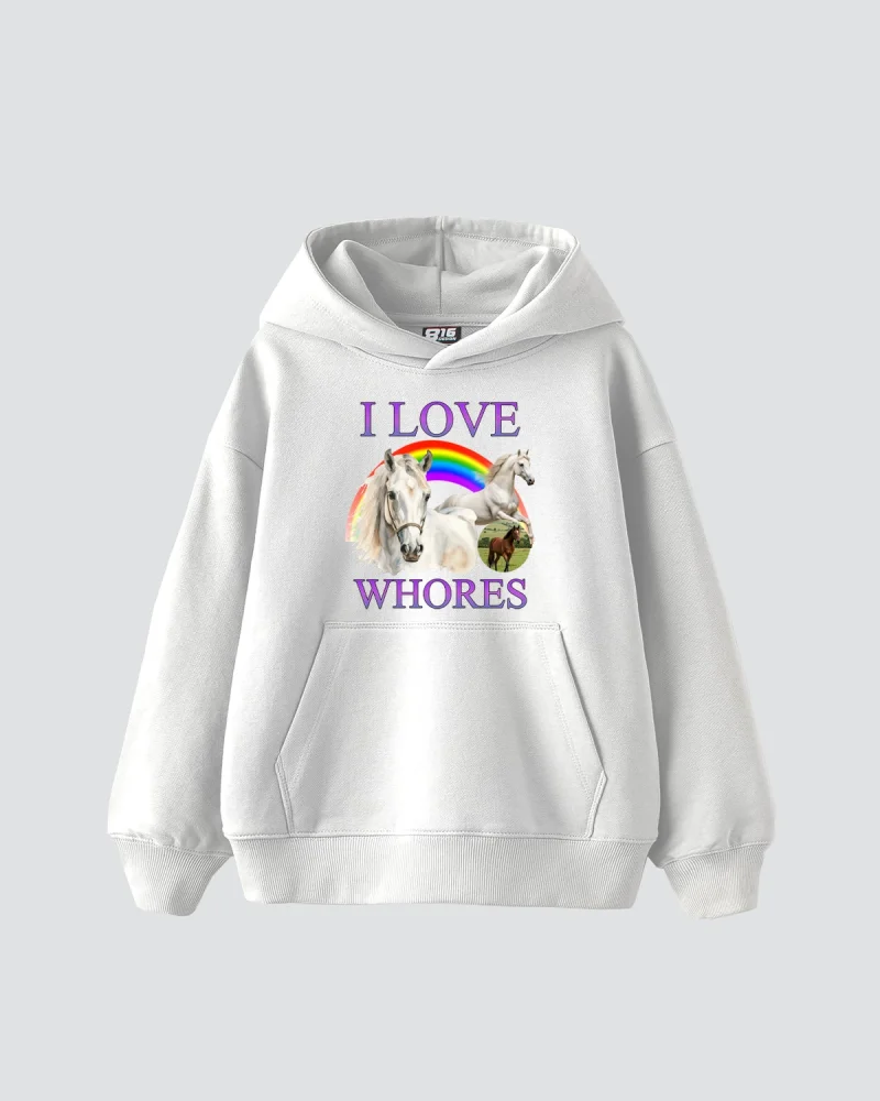 I Love Whores Baskılı Oversize Unisex Beyaz Hoodie