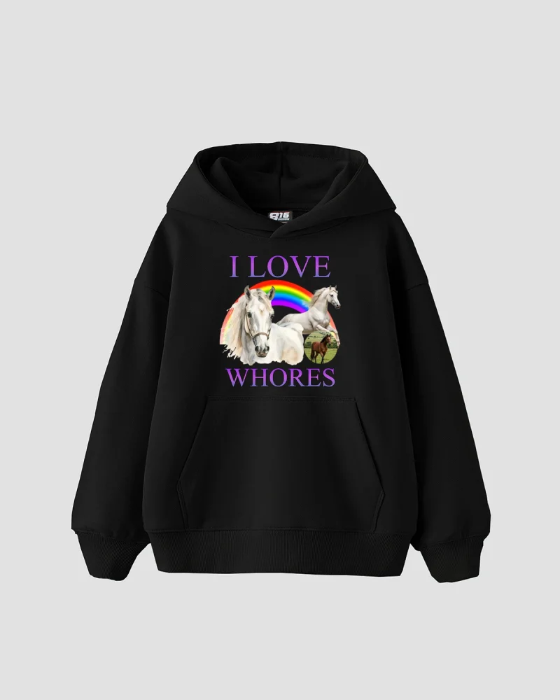 I Love Whores Baskılı Oversize Unisex Siyah Hoodie