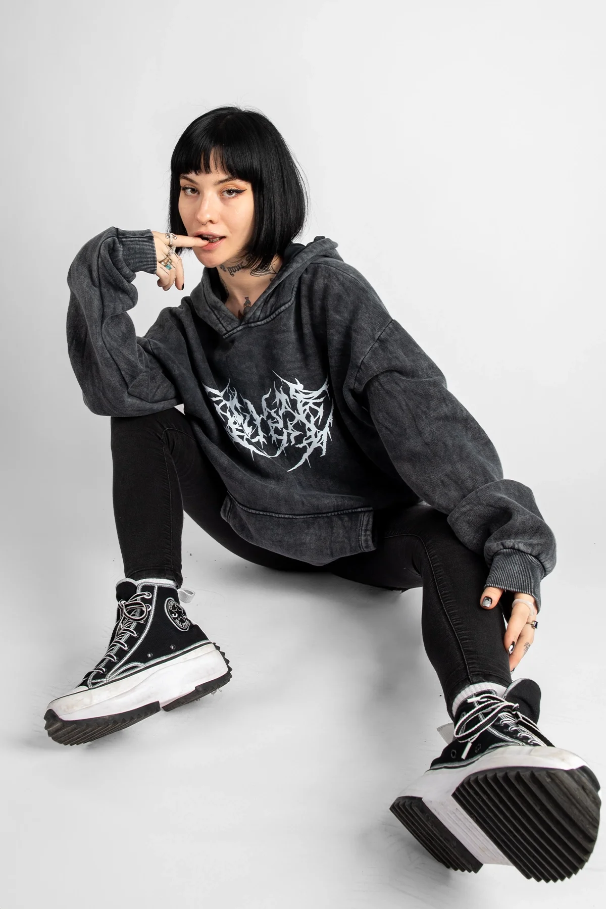 Angel Stitch Baskılı Oversize Unisex Yıkamalı Siyah Hoodie