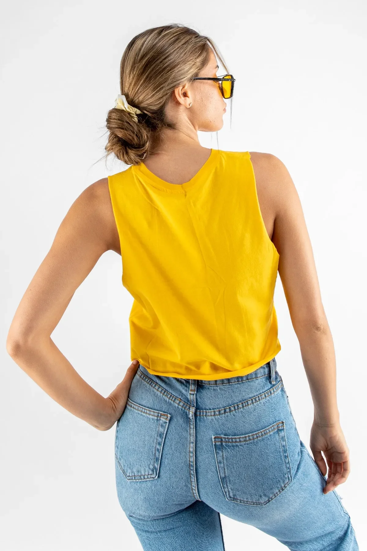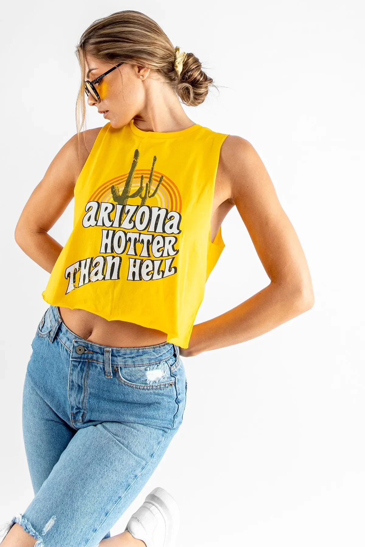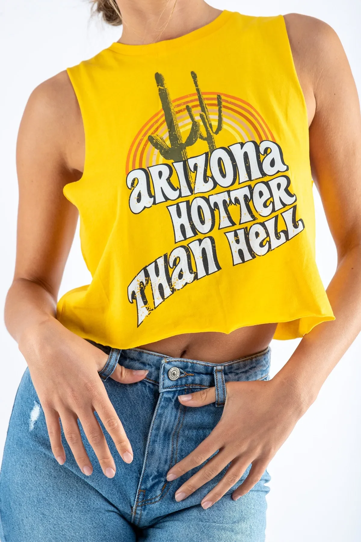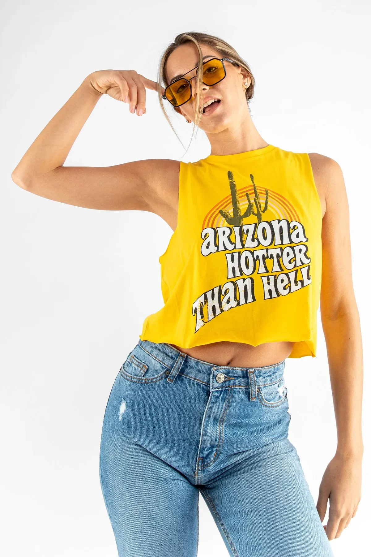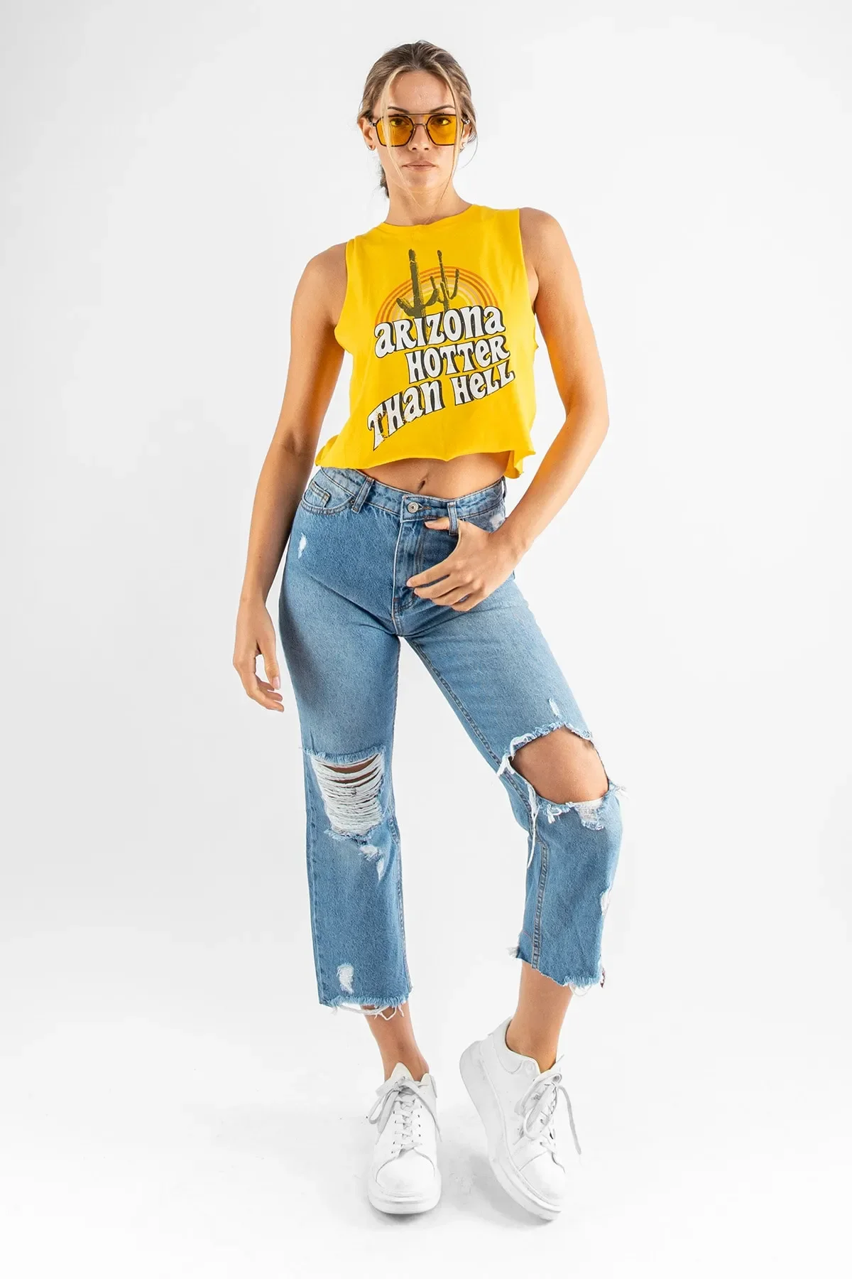 Enerjisi yüksek, tarzı dinamik! Canlı sarı rengi ve eğlenceli Arizona kaktüs baskısıyla öne çıkan bu sıfır kol crop, yaz kombinlerinin yıldızı olmaya aday. Yumuşak dokulu kumaşı ve nefes alabilen yapısıyla hem rahat hem de stil sahibi bir görünüm sunar.