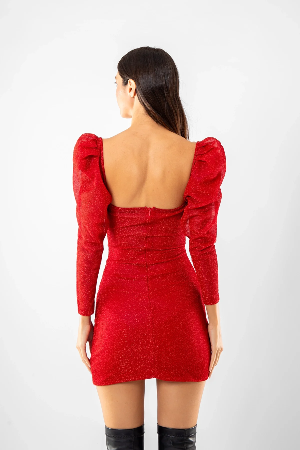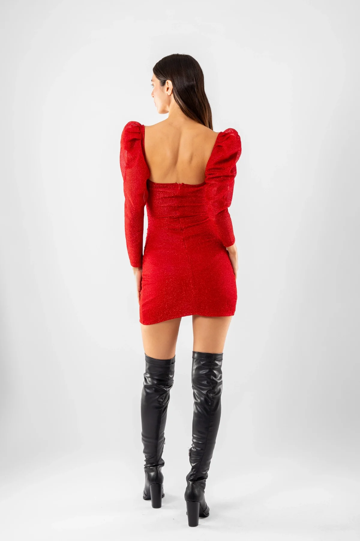Göz alıcı rengi, zarif sim detayları ve trend balon kol tasarımıyla öne çıkan bu mini elbise, davetlerin ve özel gecelerin yıldızı olmaya aday. Vücudu saran şık kalıbı, feminen siluetinizi vurgularken; gloplu kumaşı ışıkta ışıltılı bir görünüm sunar. Balon kol detayı ise elbiseye modern ve romantik bir dokunuş katar.