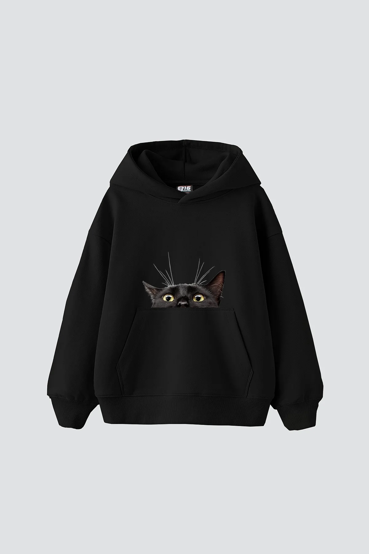 BLACK CAT BASKILI OVERSİZE UNİSEX PREMİUM SİYAH HOODİE