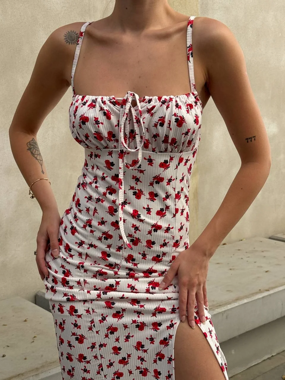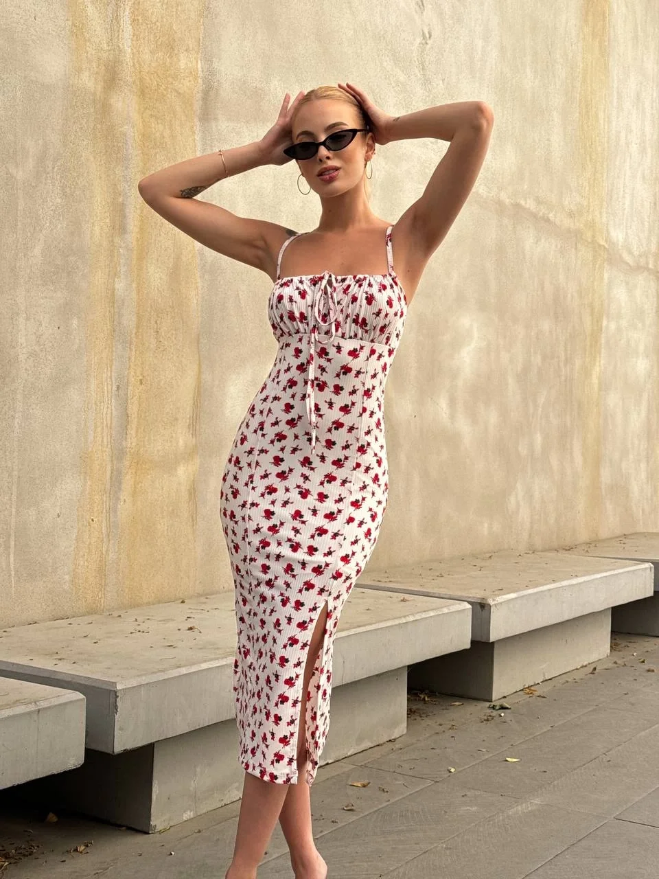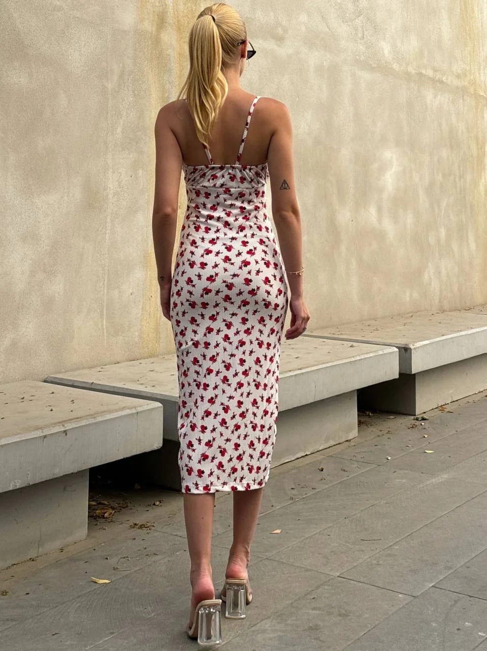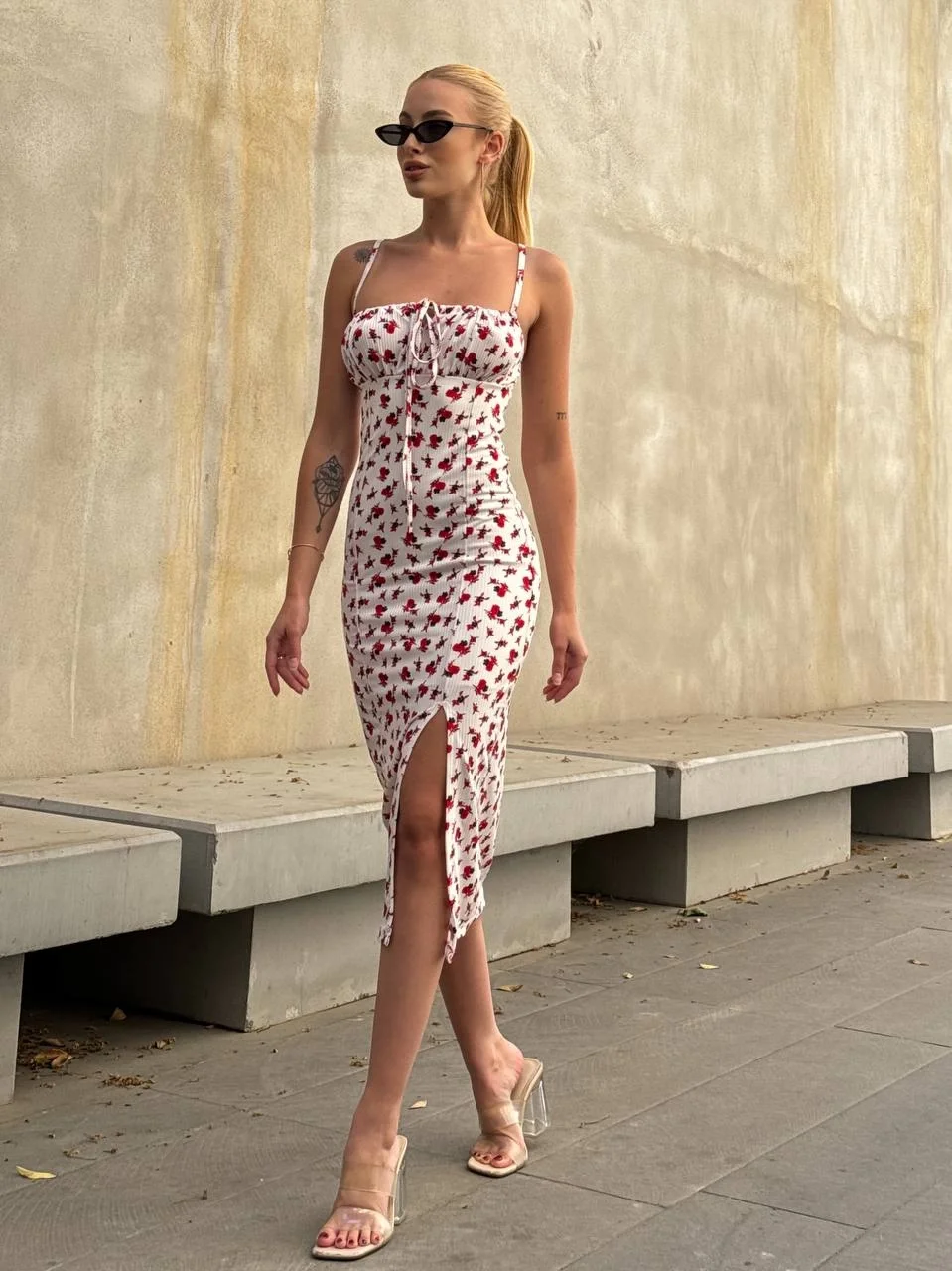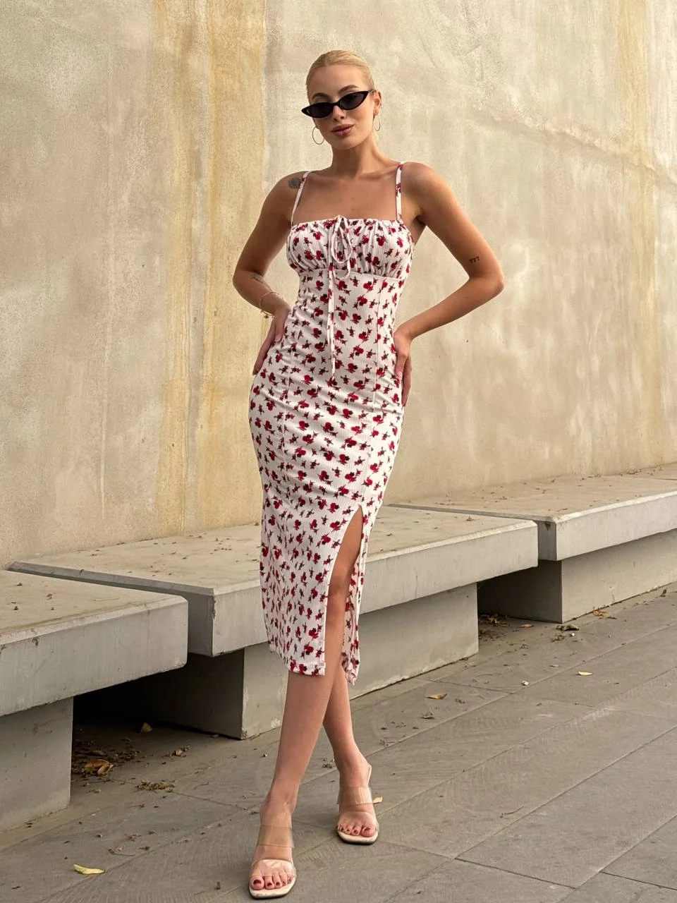 ÇİÇEK DESENLİ ASKILI YIRTMAÇLI MİDİ BOY BEYAZ ELBİSE