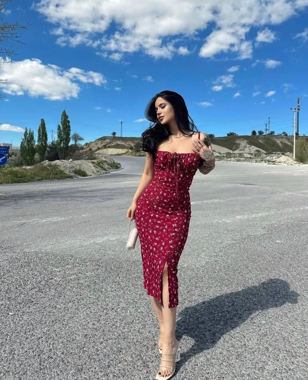 ÇİÇEK DESENLİ ASKILI YIRTMAÇLI MİDİ BOY BORDO ELBİSE