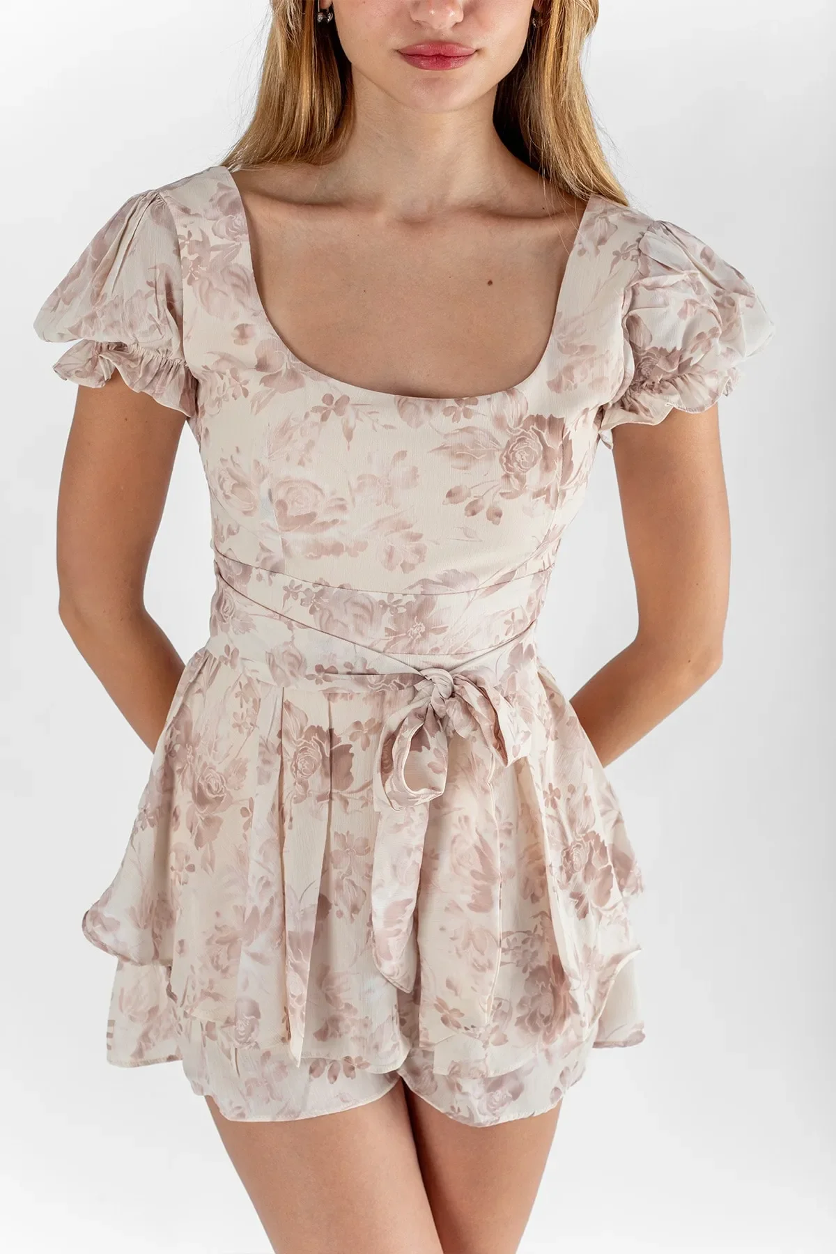 ? Çiçek Desenli Sırt Dekolteli Garneli Şortlu Ekru Mini Elbise