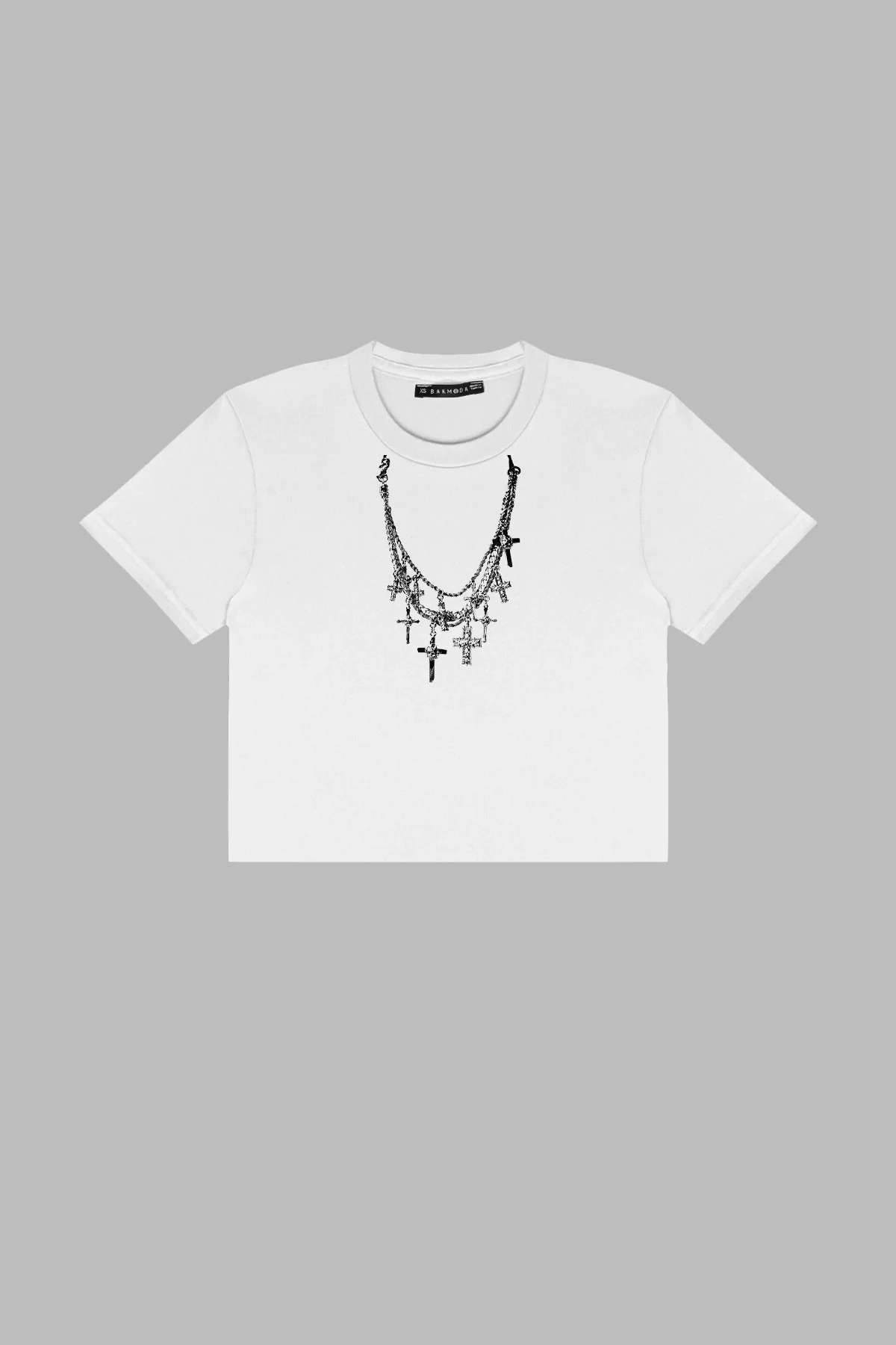 Cross Necklace baskılı Beyaz crop top ile kendinizi özgür ve şık hissedin, Bak Moda'nın kalitesi ile tarzınızı ön plana çıkarın!