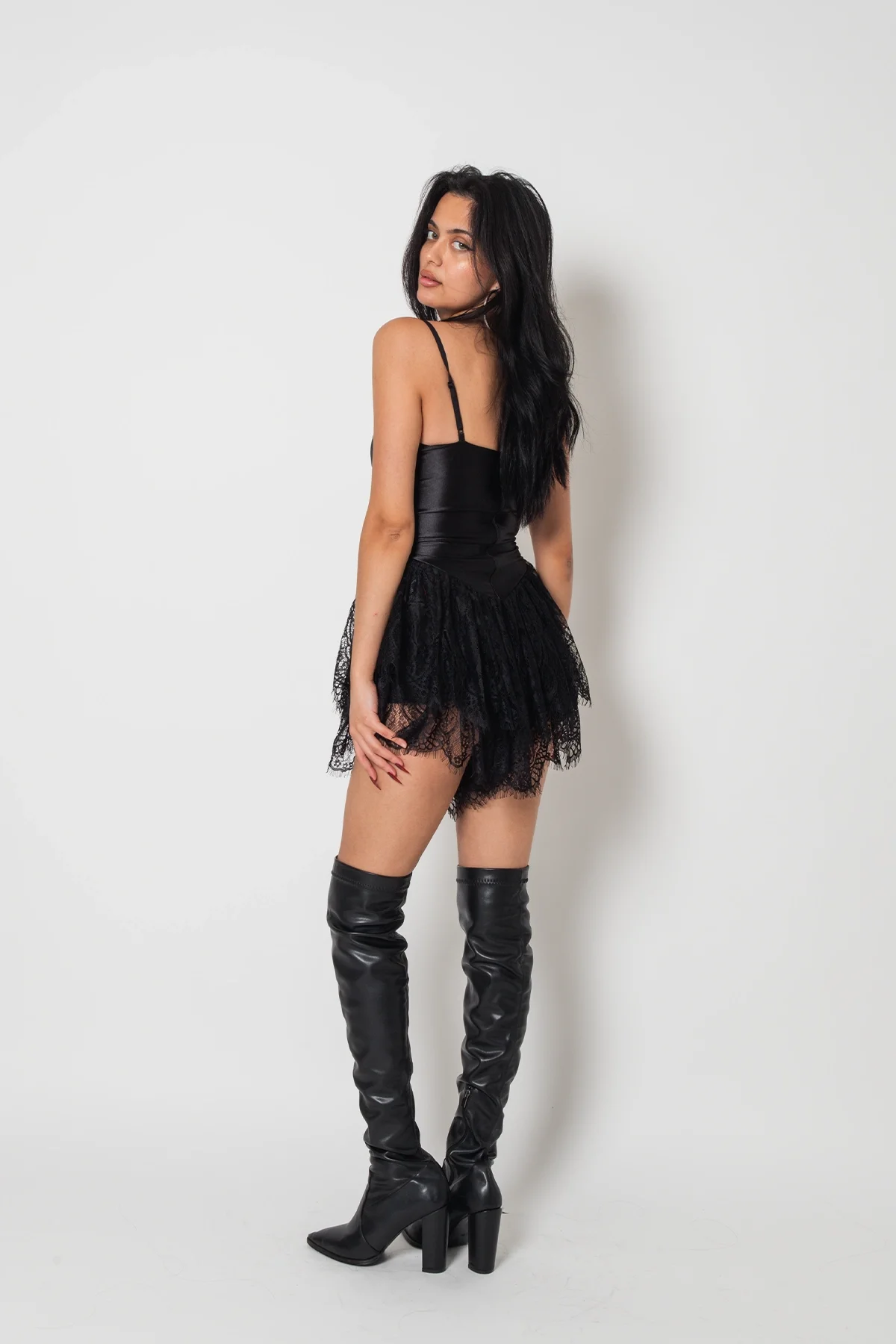 DANTEL DETAYLI KORSE GÖRÜNÜMLÜ ŞORTLU SİYAH MİNİ ELBİSE