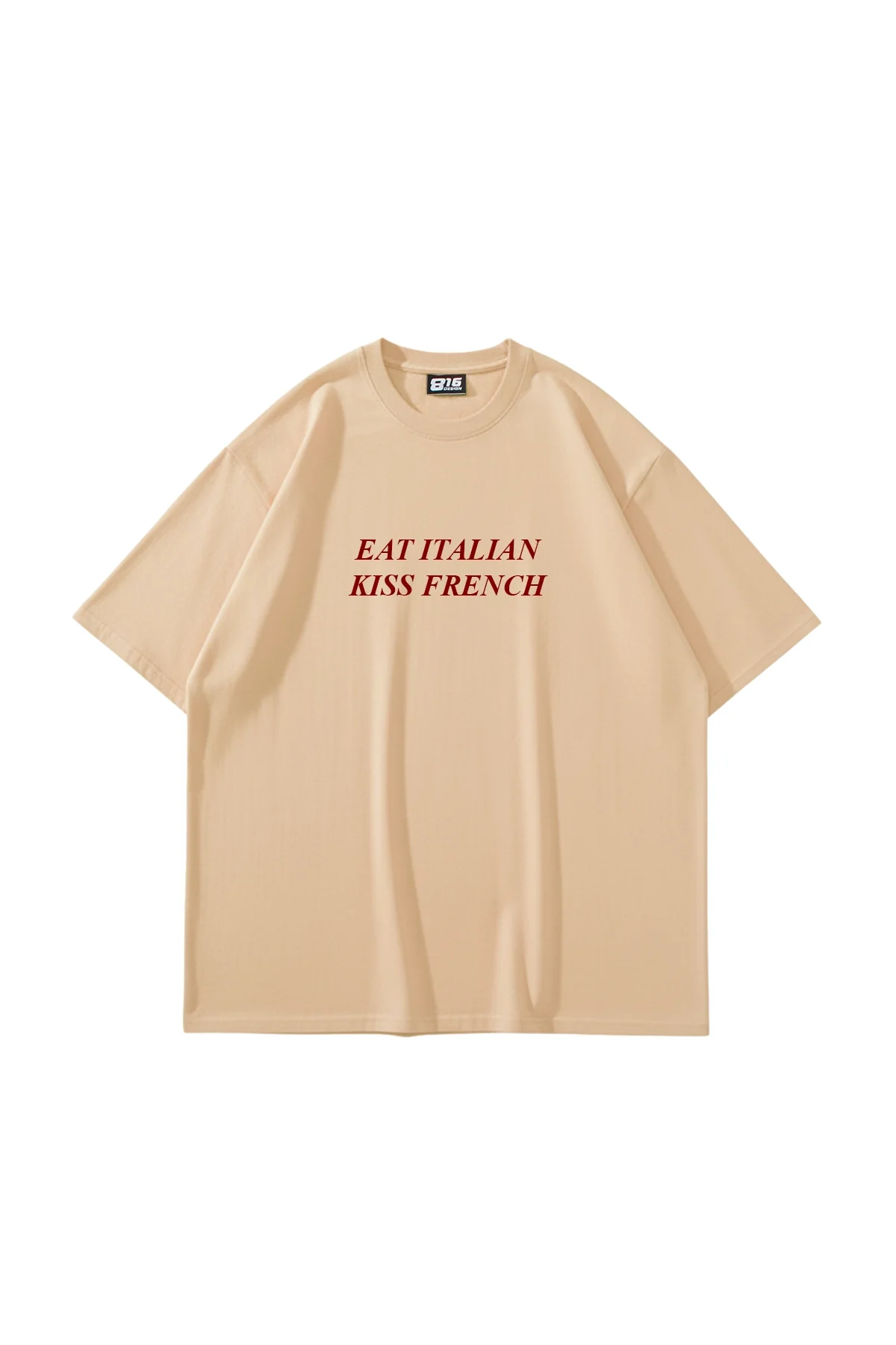 Eat Italian Kiss French Baskılı Oversize Unisex Bej Tshirt, tarzınızı yansıtmak isteyenler için ideal bir seçenektir.