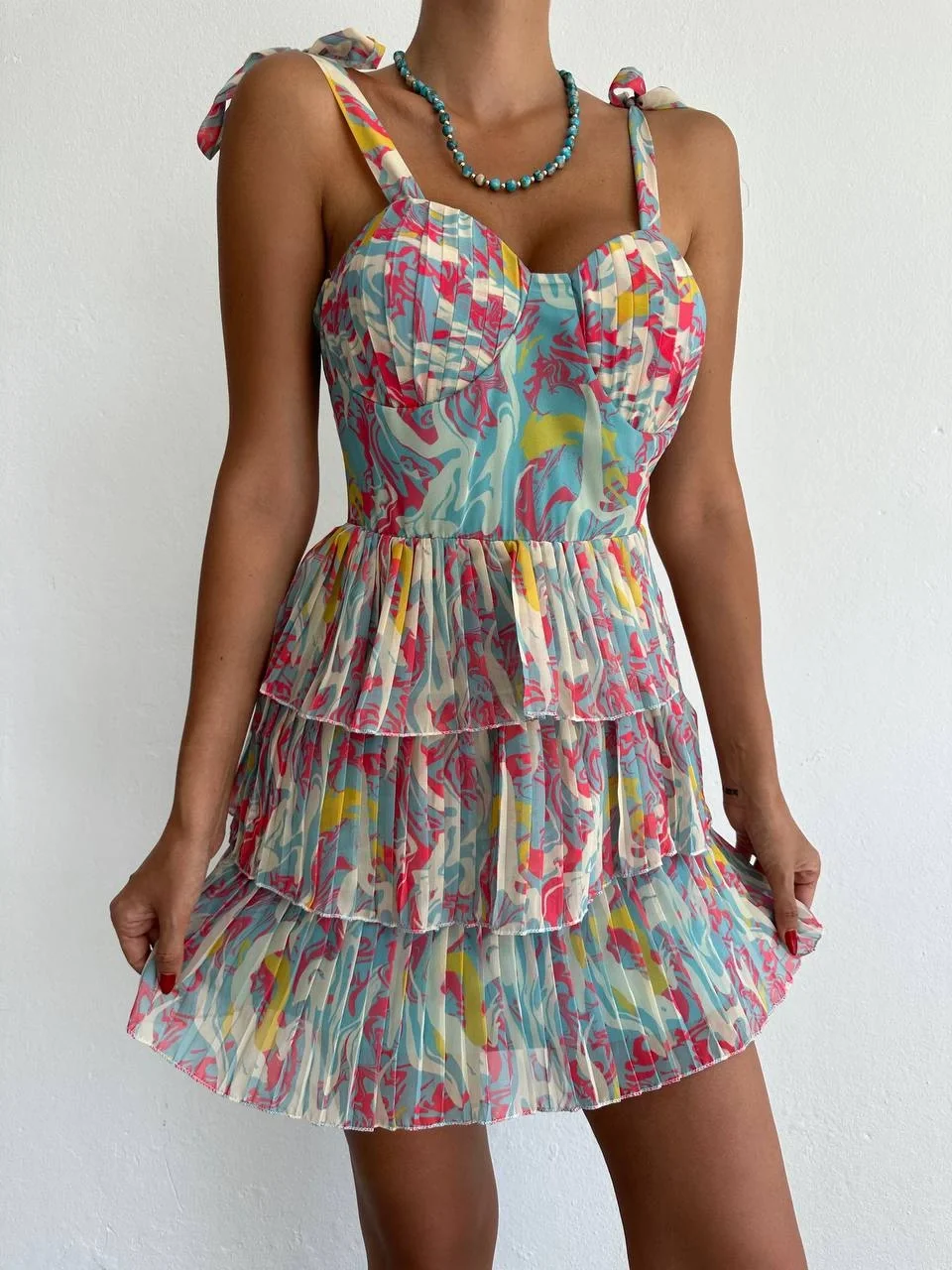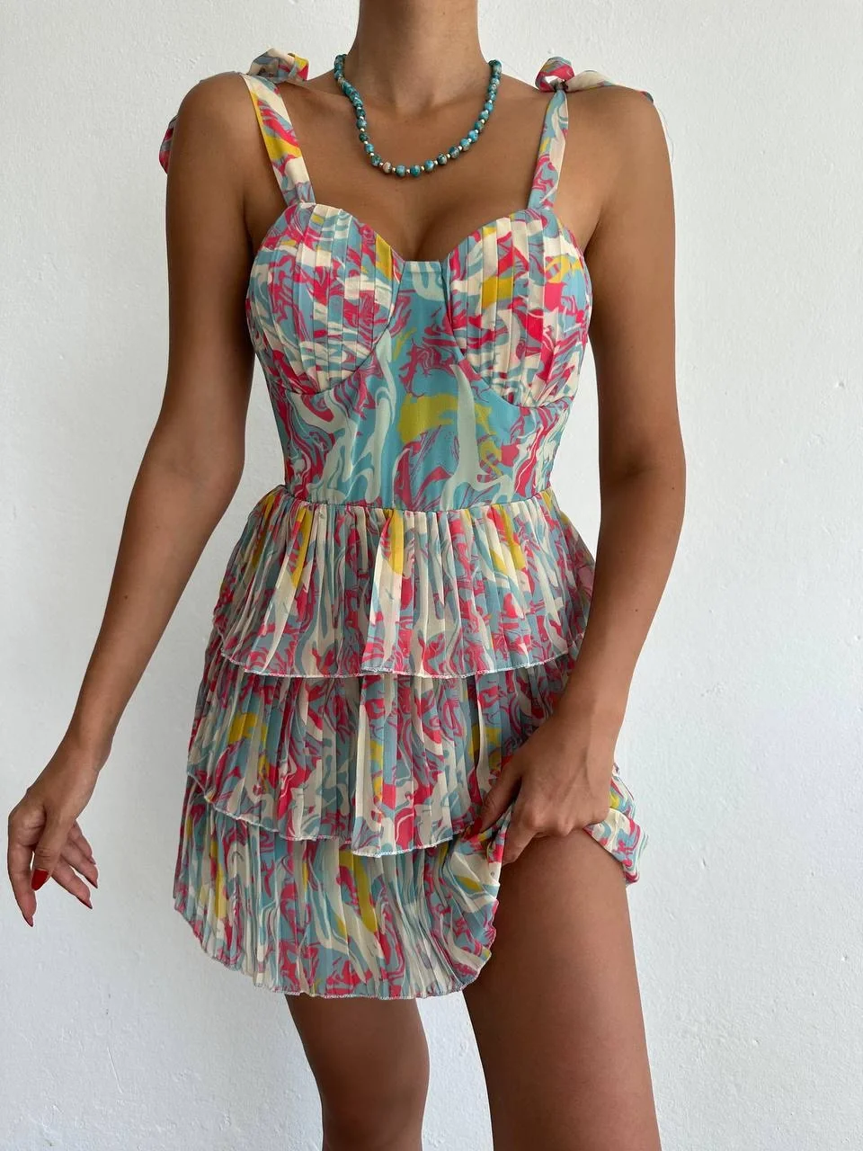 Desenli Sırt Dekolteli Mini Tül Astarlı Elbise