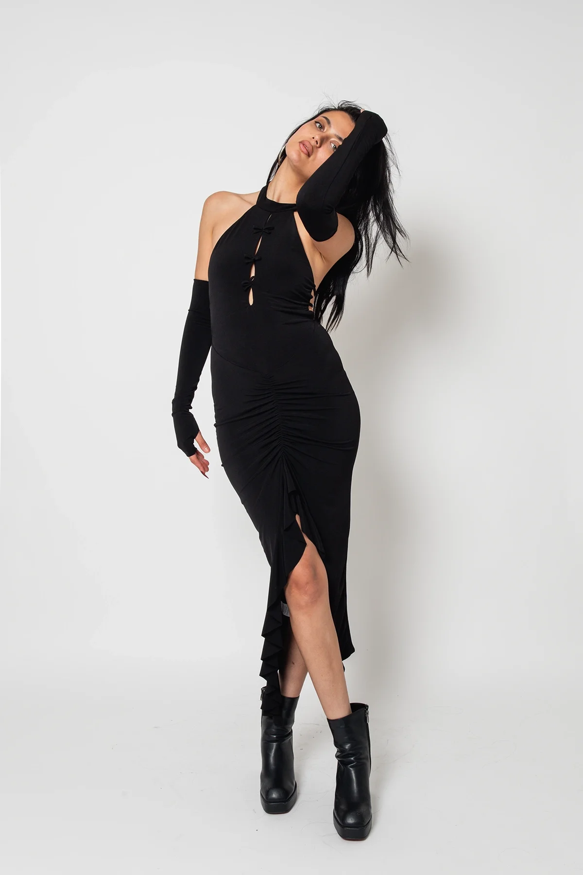 Model: Takma kollu, bel dekolteli elbise