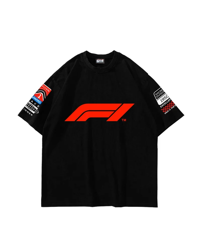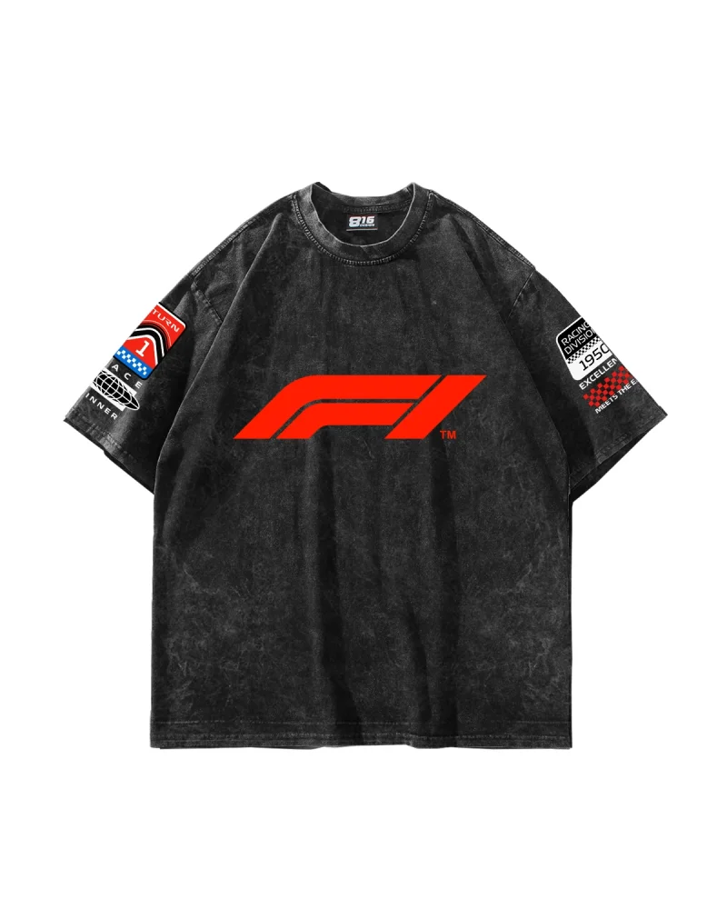 Race Baskılı Oversize Unisex Yıkamalı Siyah Tshirt