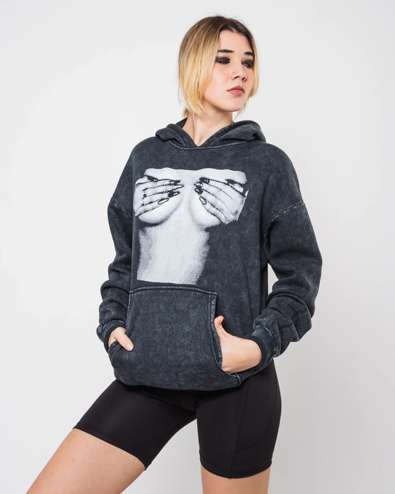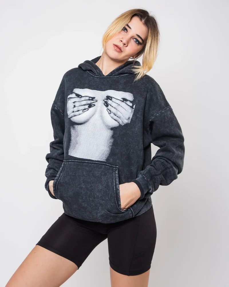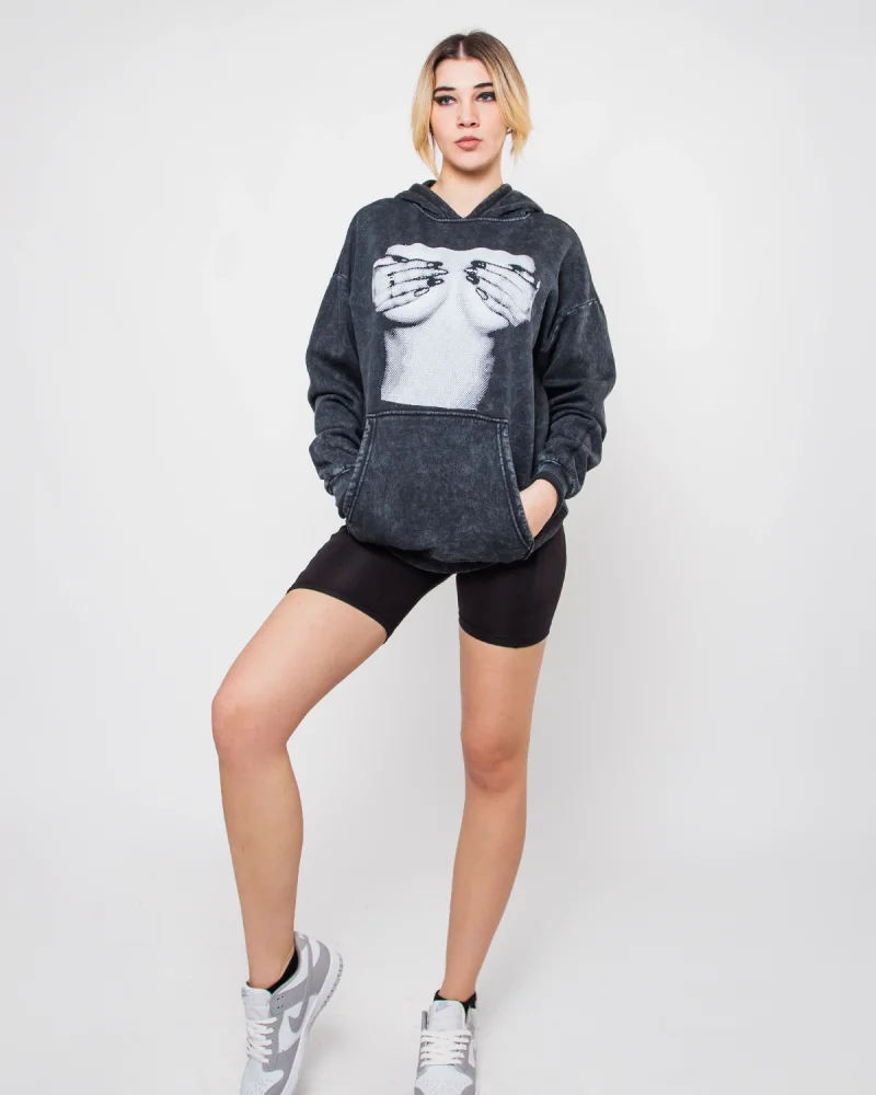Silhouette Boobs V2 Baskılı Oversize Unisex Yıkamalı Siyah Hoodie