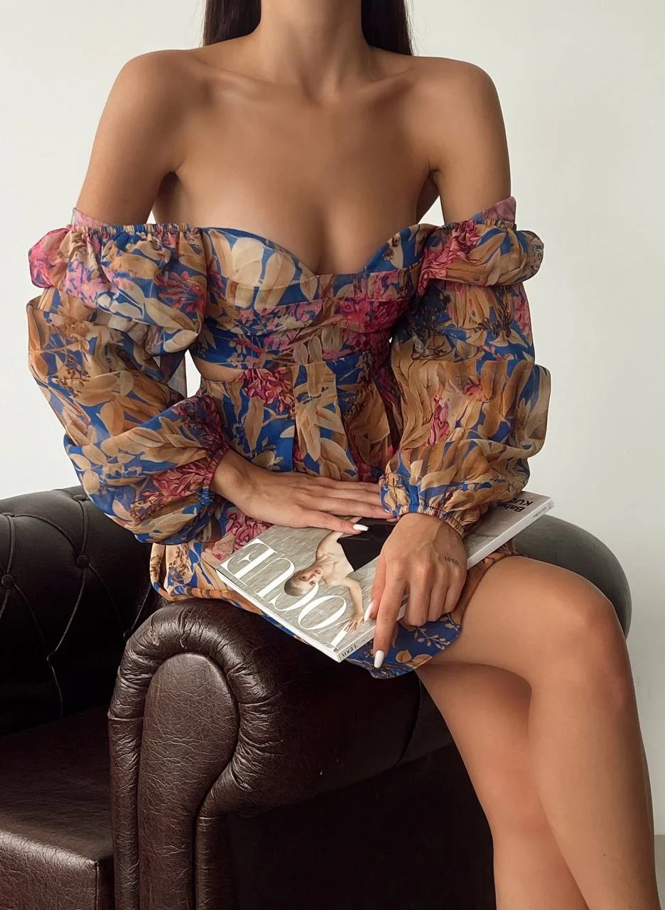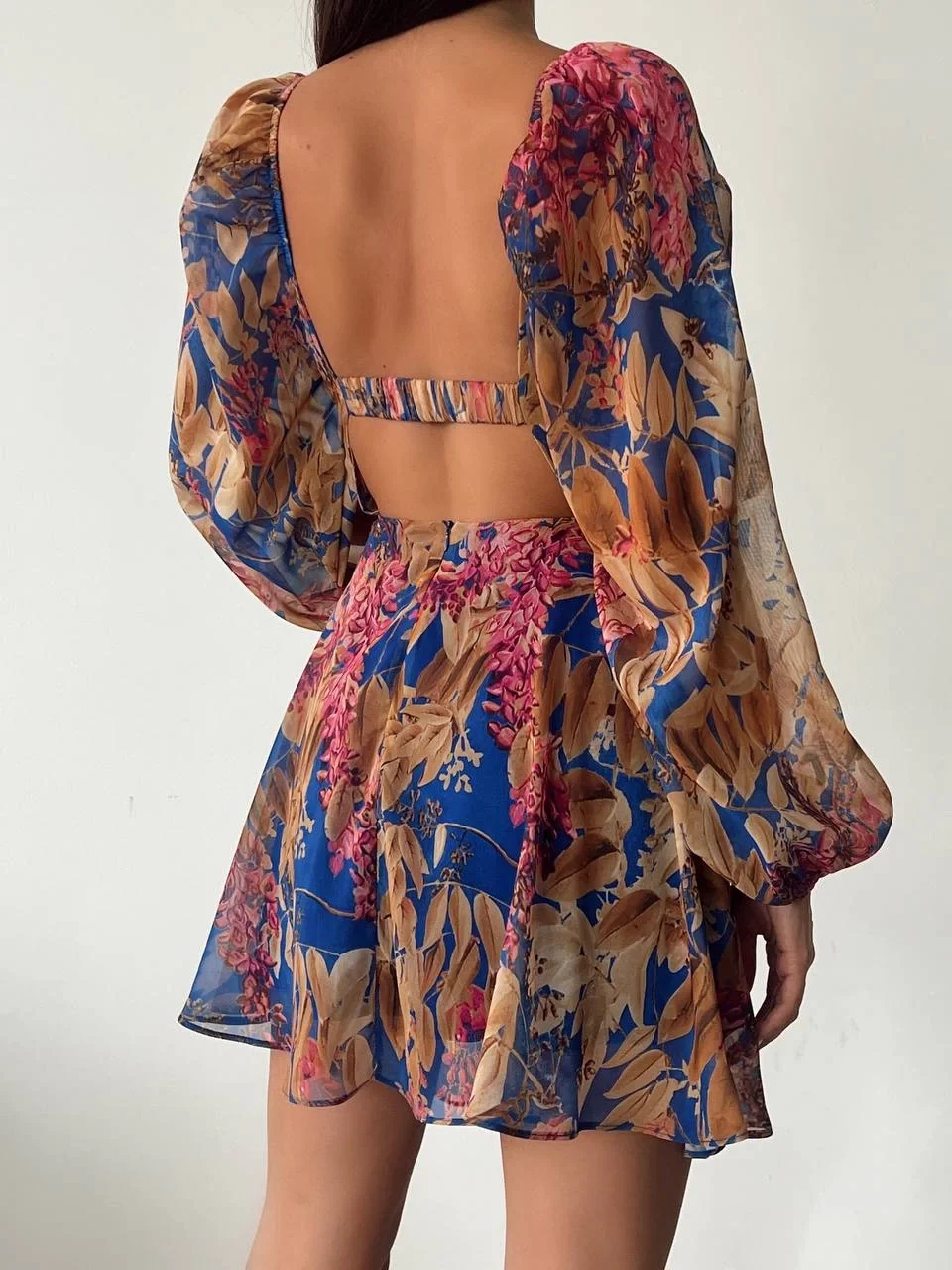 Desenli Sırt Dekolteli Mini Tül Astarlı Elbise