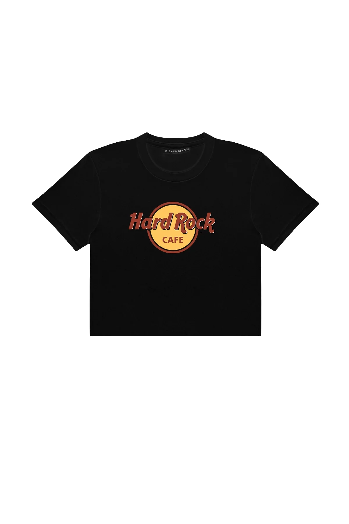 Hard Rock baskılı siyah crop top ile kendinizi özgür ve şık hissedin, Bak Moda'nın kalitesi ile tarzınızı ön plana çıkarın!
