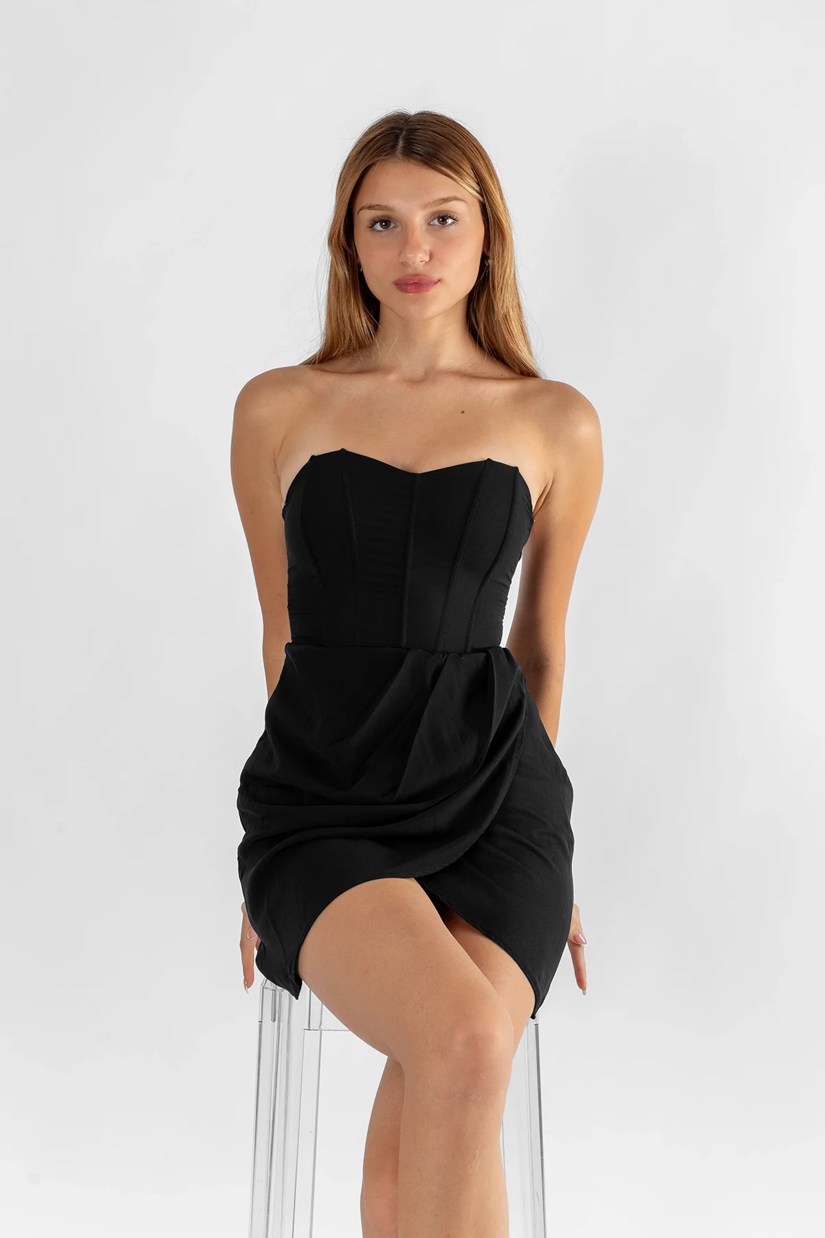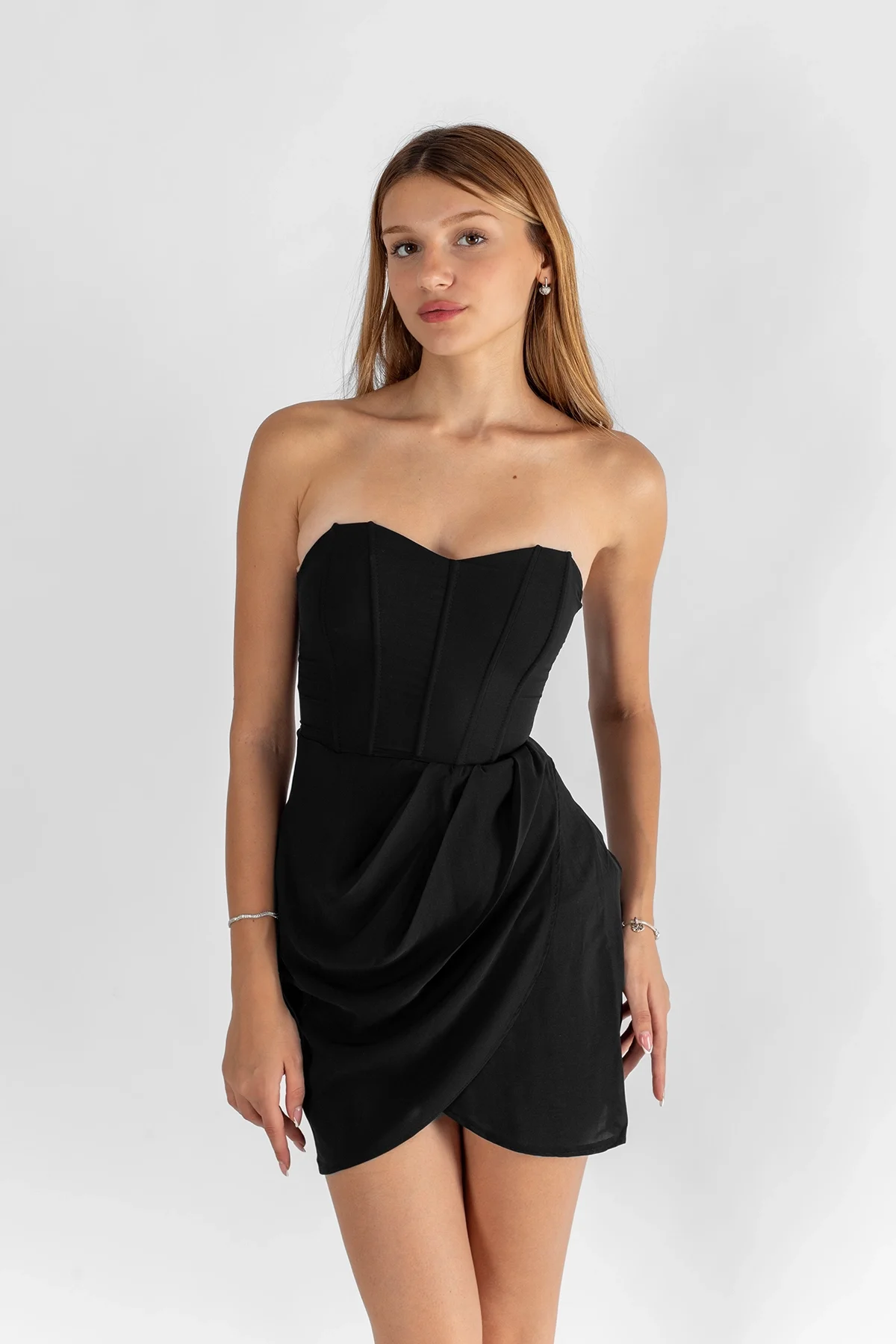 Göğüs kısmında korse dikiş detaylarıyla şekillendirilen bu straplez mini elbise, siyahın enerjik tonu ile dikkat çeker. Vücudu saran formu ve mini boyuyla feminen ve iddialı bir görünüm sunar.