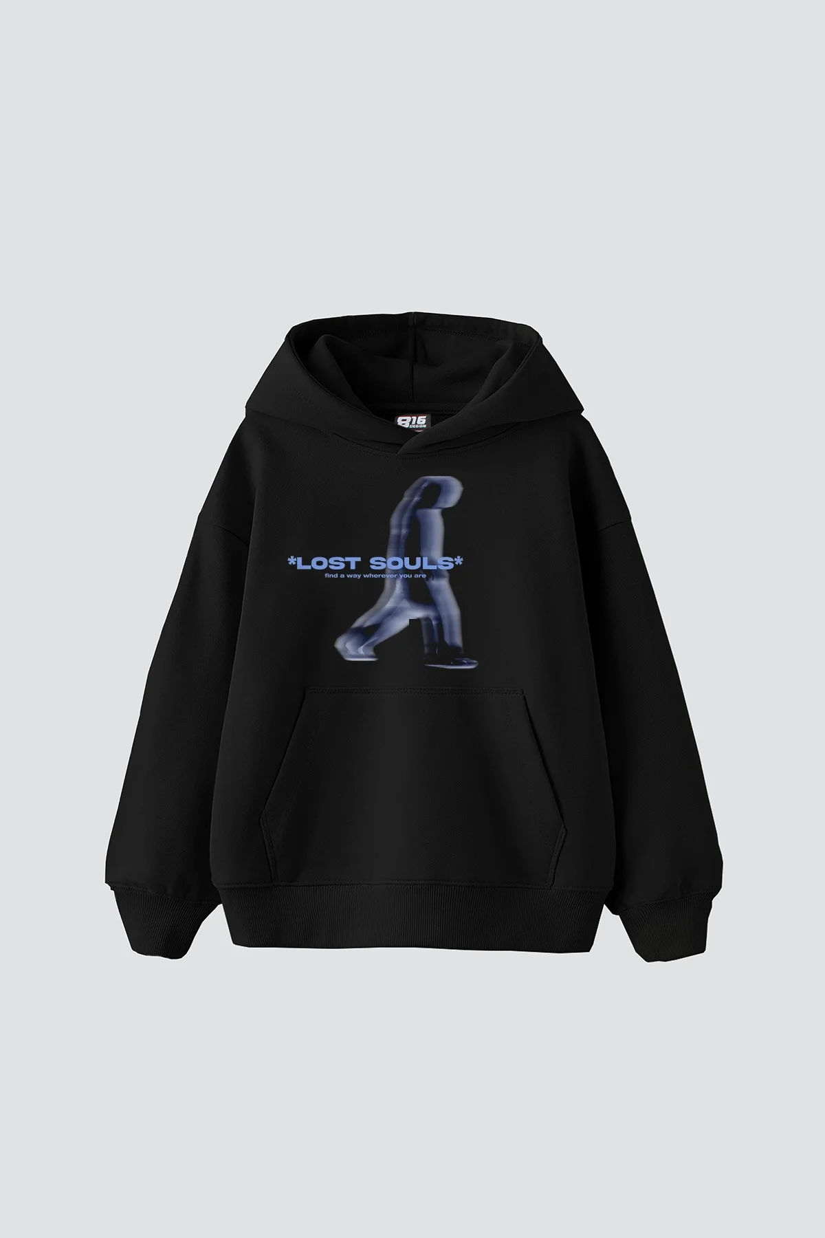 LOST SOULS BASKILI OVERSİZE UNİSEX PREMİUM SİYAH HOODİE