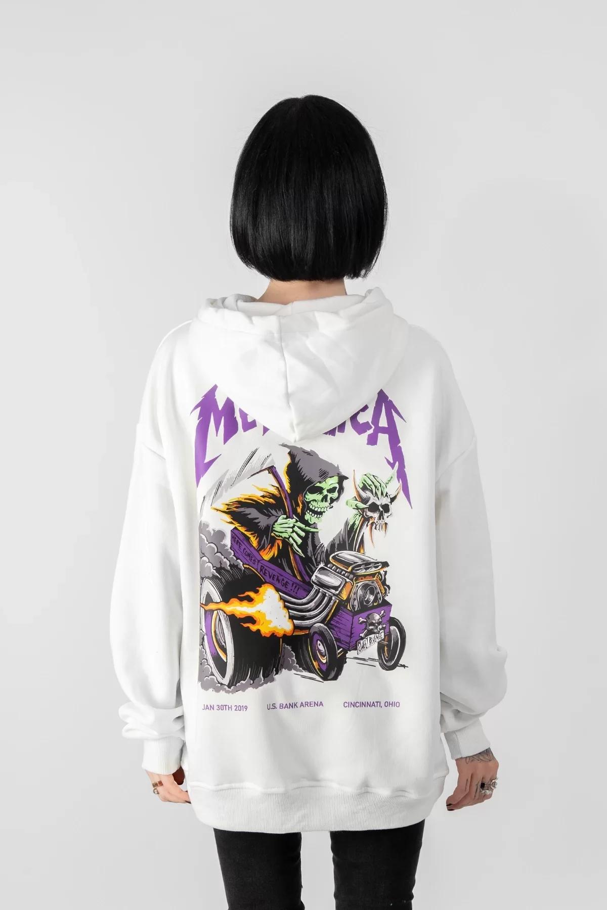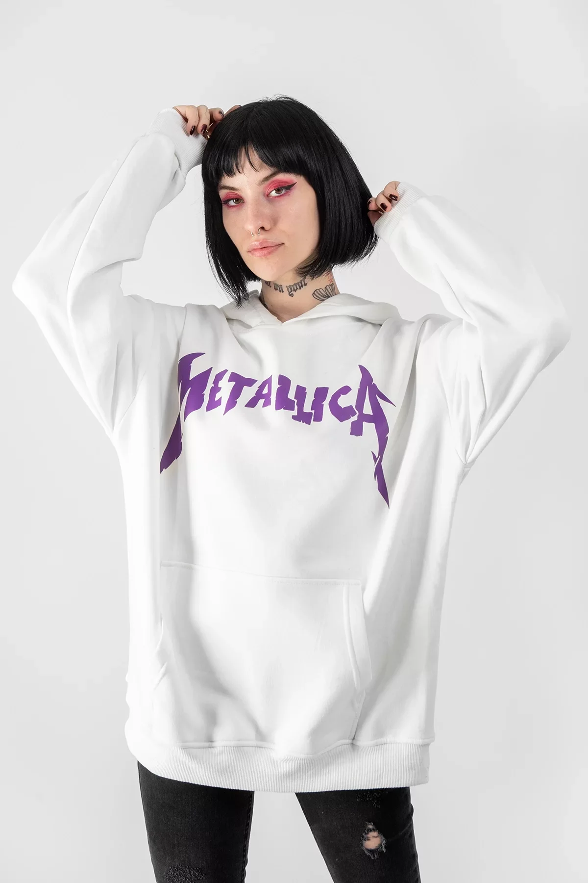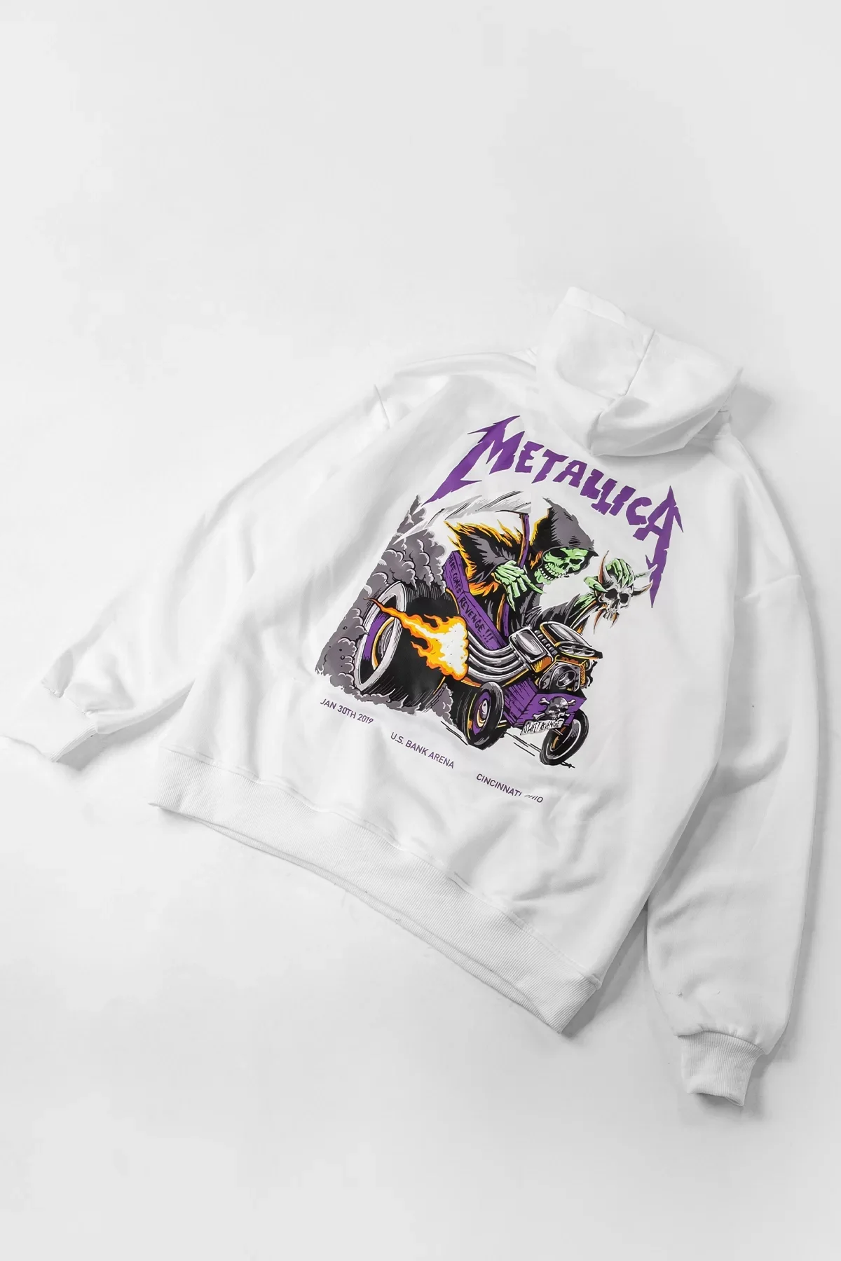 METALLİCA MOR SIRT BASKILI BEYAZ OVERSİZE KAPÜŞONLU SWEATSHİRT