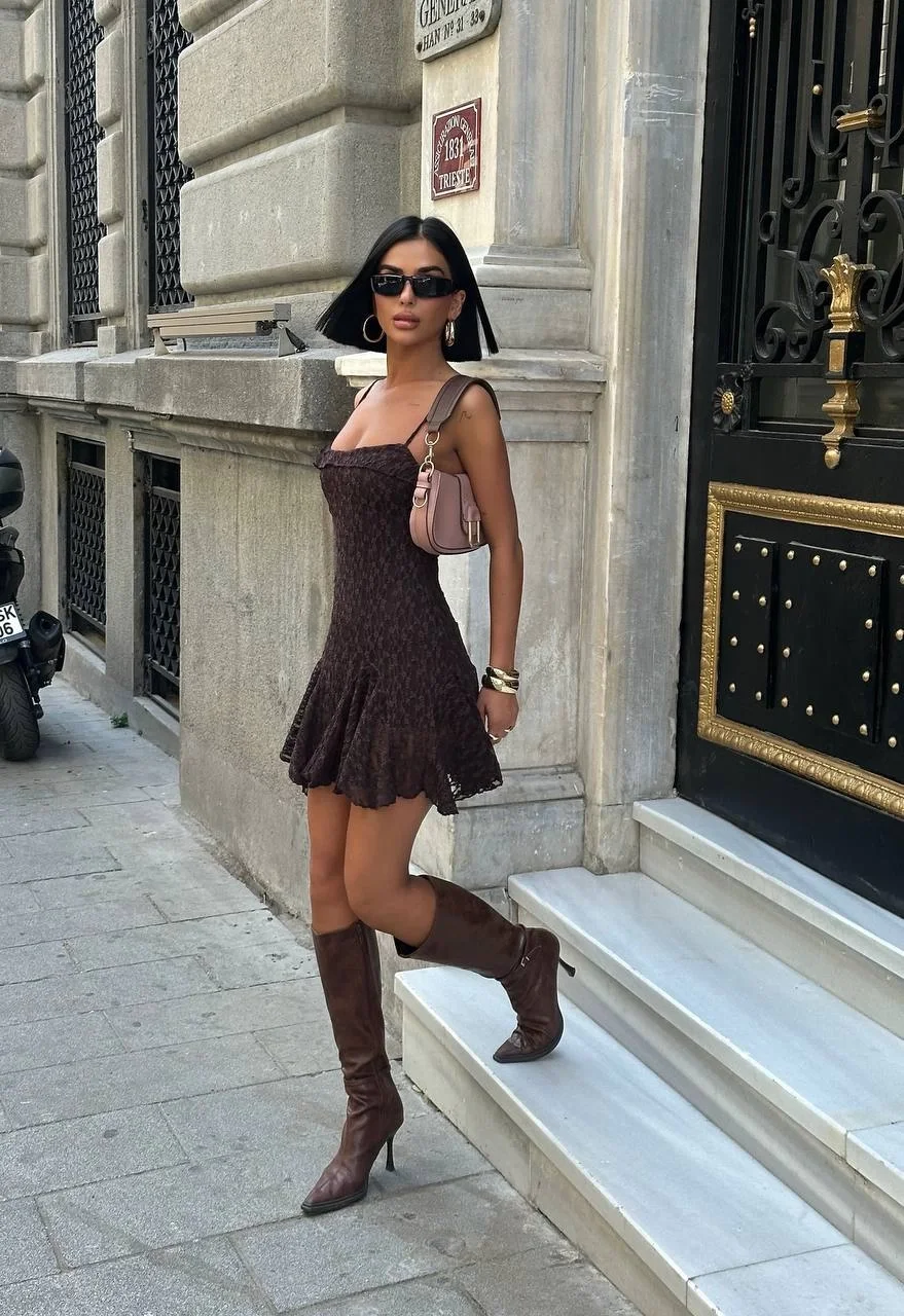 Zarif, romantik ve feminen dokunuşların bir araya geldiği mini dantel fırfırlı elbise, özel anlarda fark yaratmak isteyenler için tasarlandı. İnce işçilikle hazırlanmış dantel dokusu ve uçuşan fırfır detaylarıyla hem şık hem de naif bir görünüm sunar.